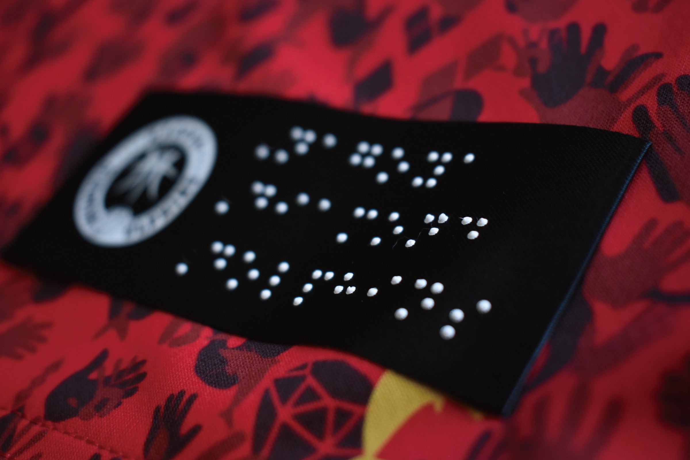 デザインとして点字を活用したシャツは、胸部にクラブ名「NAGOYA DAIAMOND DOLPHINS」を、右袖にはホームタウン名「NAGOYA」を、背中には「DOLPHINS SMILE」で配置。右胸のヒュンメルロゴも、「hummel」を点字で表した今回だけのロゴに。シャツの裾部には、クラブ名を点字加工で施し、浮き出た文字を指先で触って読み取れるようにしています。