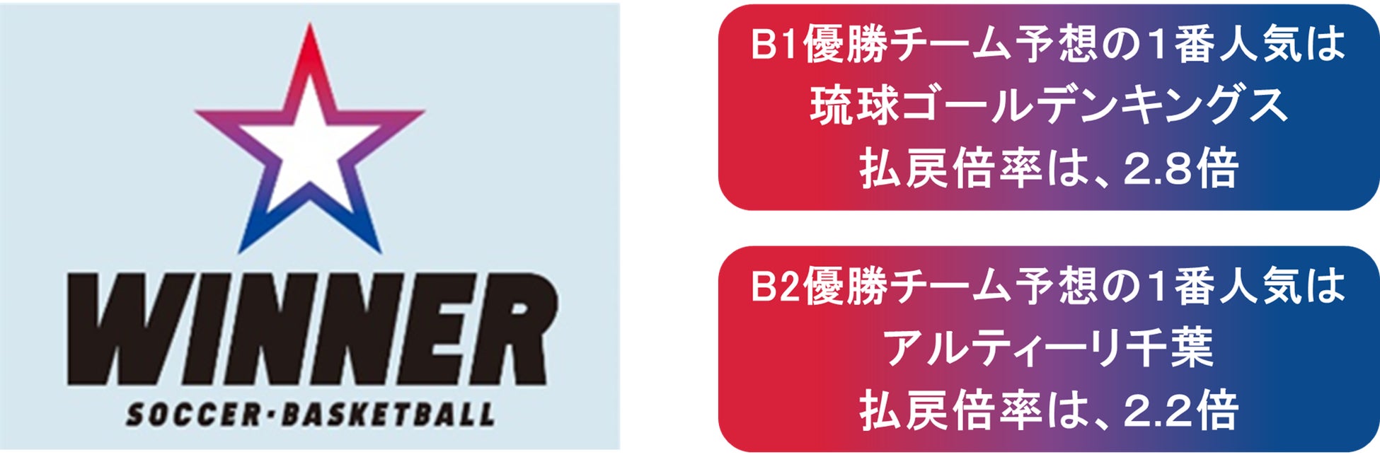 B1優勝チーム予想の1番人気は、 昨シーズン1位の琉球ゴールデンキングスで、払戻倍率(オッズ)は2.8倍!2番人気は、同2位の千葉ジェッツで、払戻倍率(オッズ)は3.4倍、3番人気は、昨シーズン東地区3位の宇都宮ブレックスで、払戻倍率(オッズ)は4.1倍となっています。