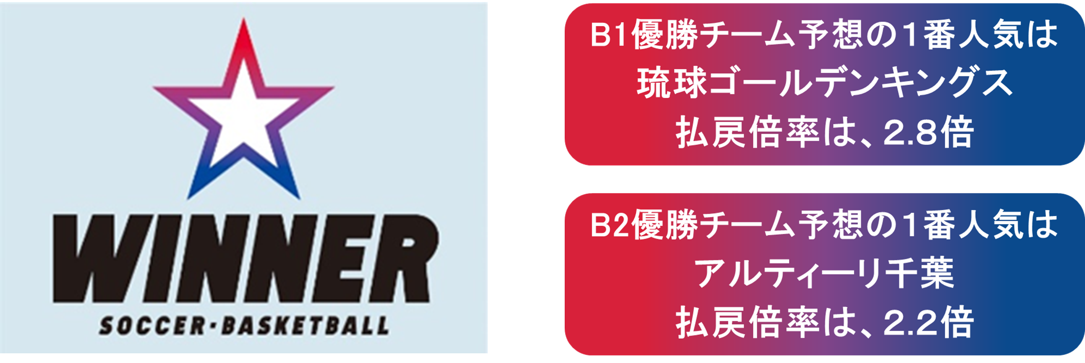 B1優勝チーム予想の1番人気は、 昨シーズン1位の琉球ゴールデンキングスで、払戻倍率(オッズ)は2.8倍!2番人気は、同2位の千葉ジェッツで、払戻倍率(オッズ)は3.4倍、3番人気は、昨シーズン東地区3位の宇都宮ブレックスで、払戻倍率(オッズ)は4.1倍となっています。