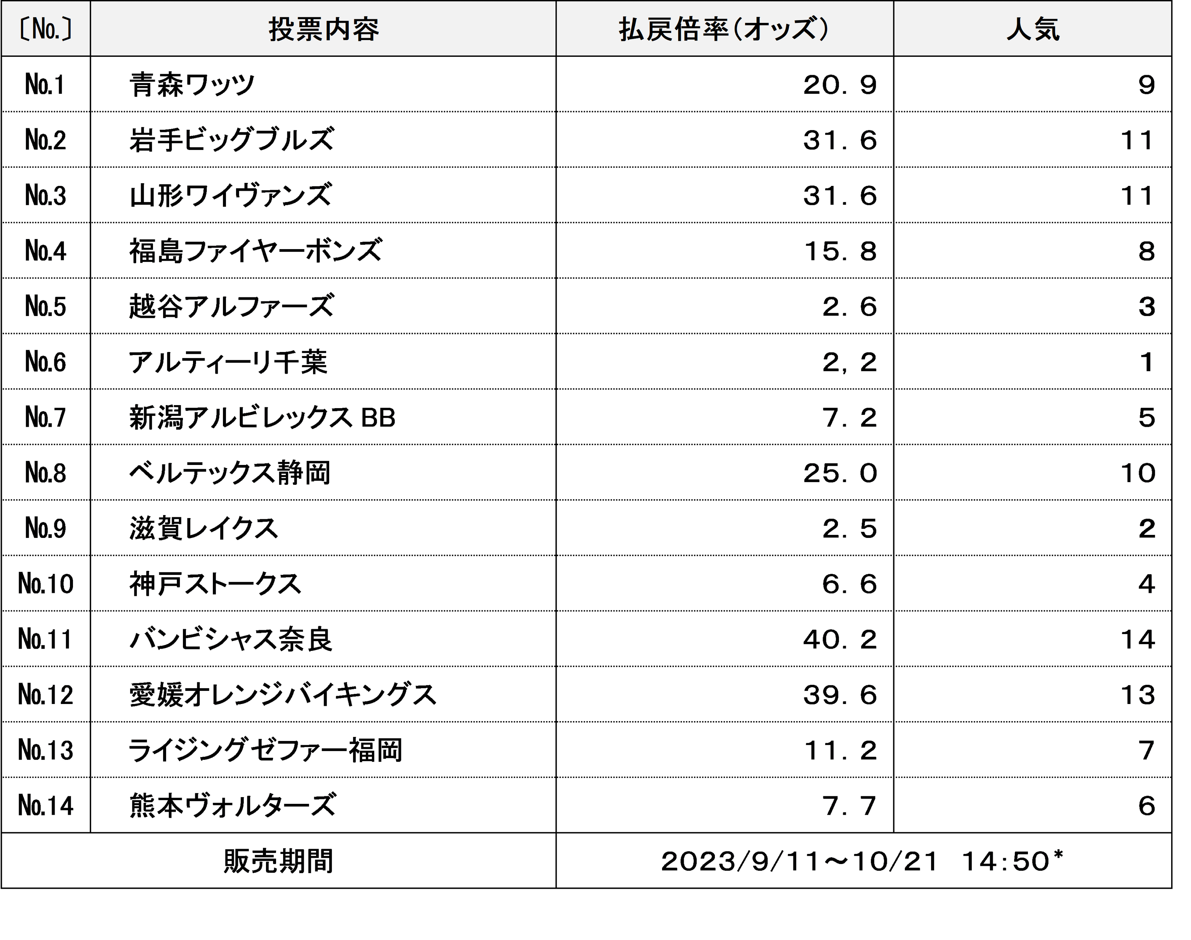 B2優勝チーム予想の1番人気は、 昨シーズン4位のアルティーリ千葉で、払戻倍率(オッズ)は2.2倍!2番人気は、 B1復帰を目指す滋賀レイクスで、払戻倍率(オッズ)は2.5倍、3番人気は、昨シーズンベスト8の越谷アルファーズで、払戻倍率(オッズ)は2.6倍となっています。