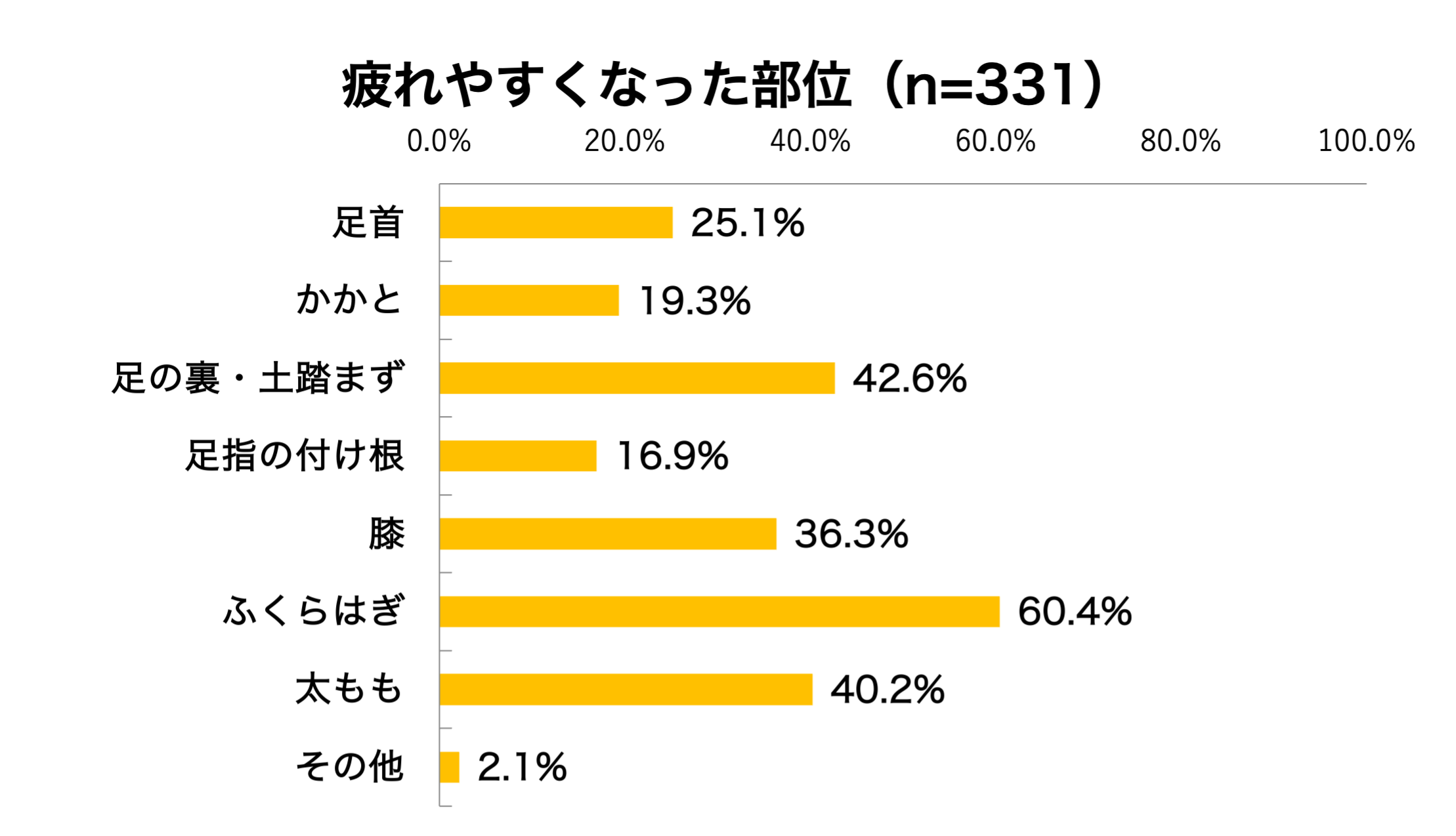 疲れやすくなった部位の1位「ふくらはぎ」、2位「足の裏・土踏まず」