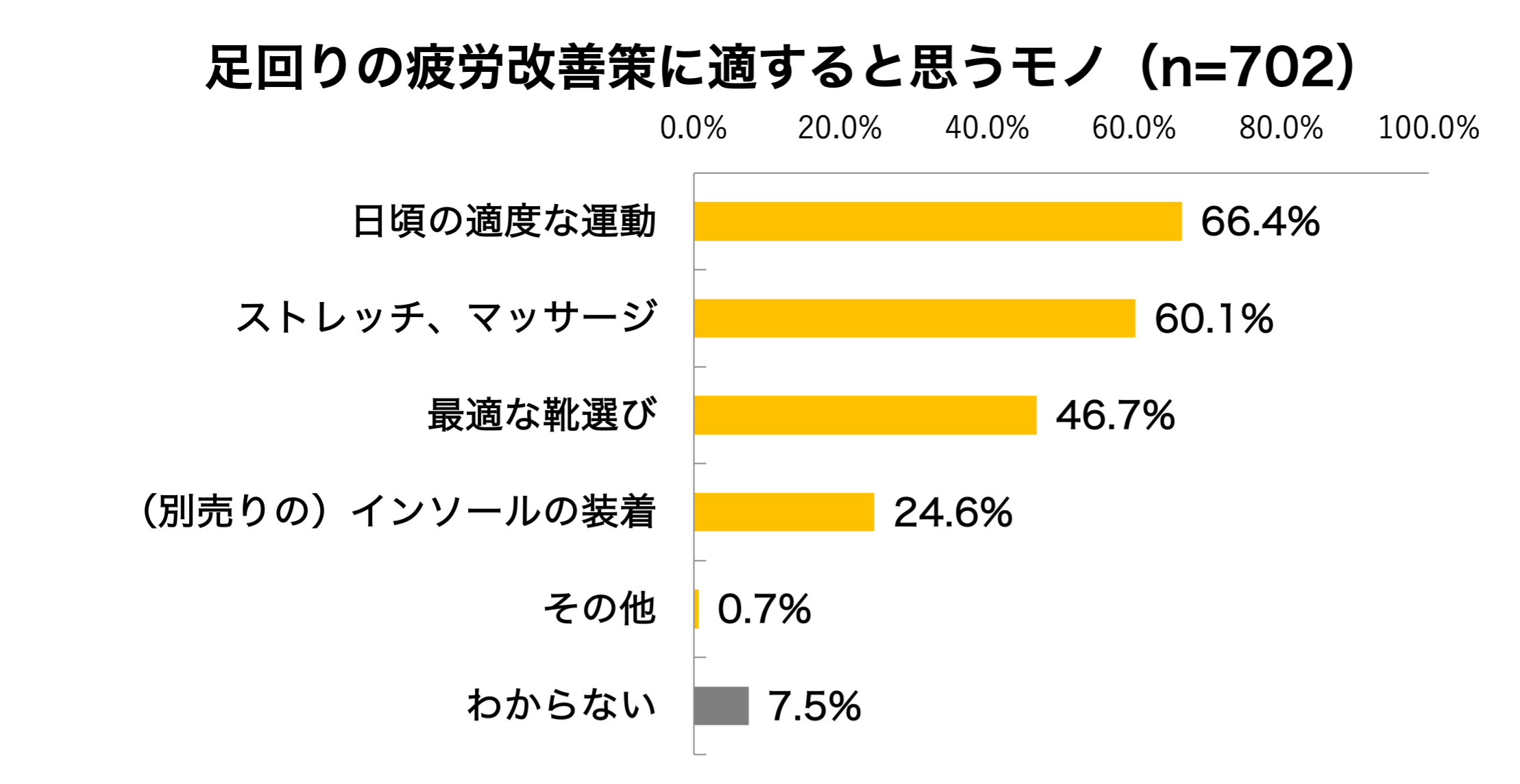また、足回りの疲労の改善および対策として適切だと思うものを尋ねたところ、「日頃の適度な運動」(66.4%)、「ストレッチ・マッサージ」(60.1%)がそれぞれ支持される一方、「(別売りの)インソールの装着」(24.6%)と回答した方も4人に1人おり、足のトラブル改善の手段として、インソールの重要性が認知されてきたと言えるでしょう。