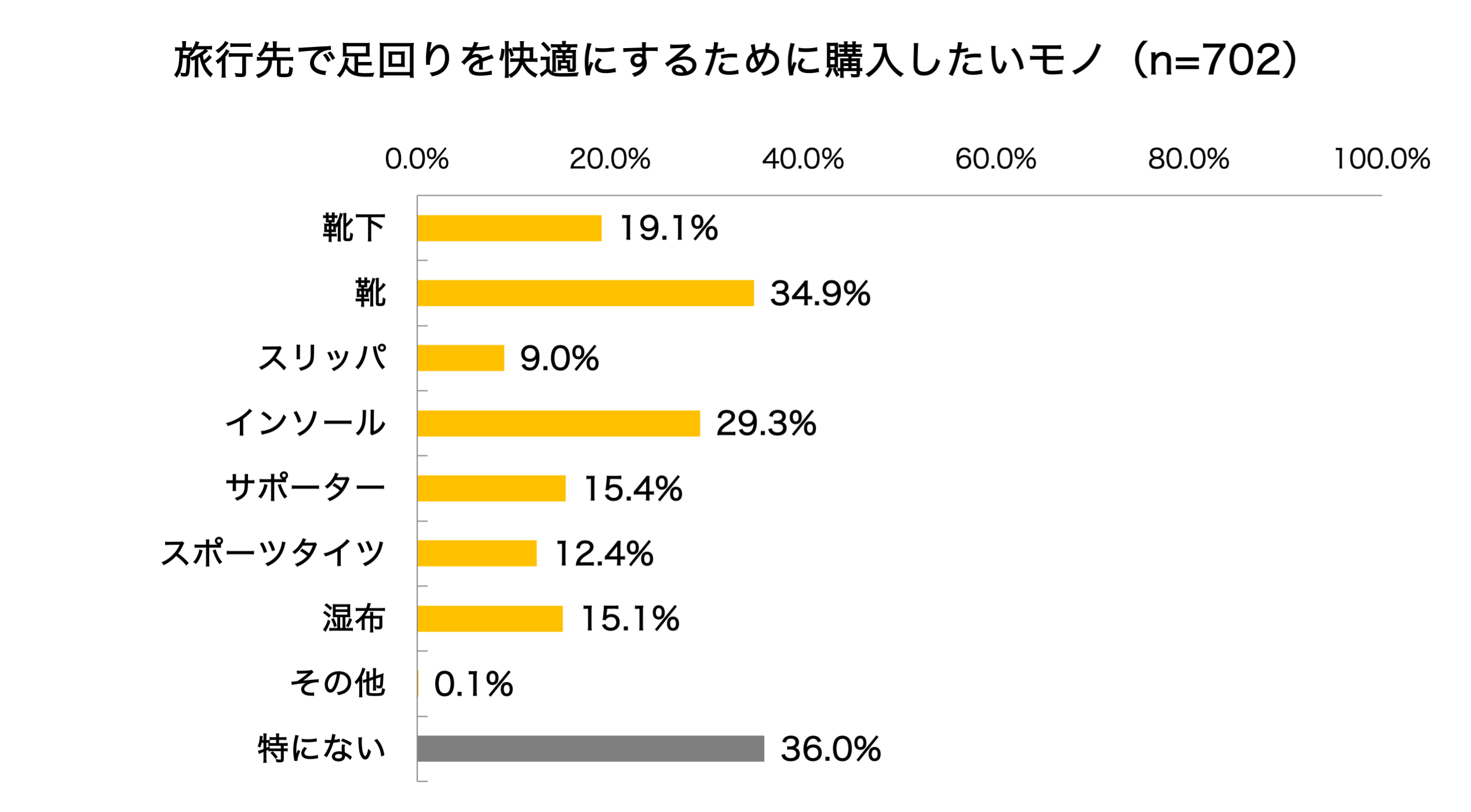 旅行先での足回りを快適にするために新たに購入準備したものを尋ねたところ、「靴」(24.8%)、「靴下」(20.2%)の2アイテムが上位を占め、ついで「インソール」(16.4%)が挙げられました。一方、今後購入したいと思うものについては、1位は変わらず「靴」(34.9%)になったものの、2位に「インソール」(29.3%)がランクインし、旅行経験者にとって注目アイテムであることが明らかになりました。