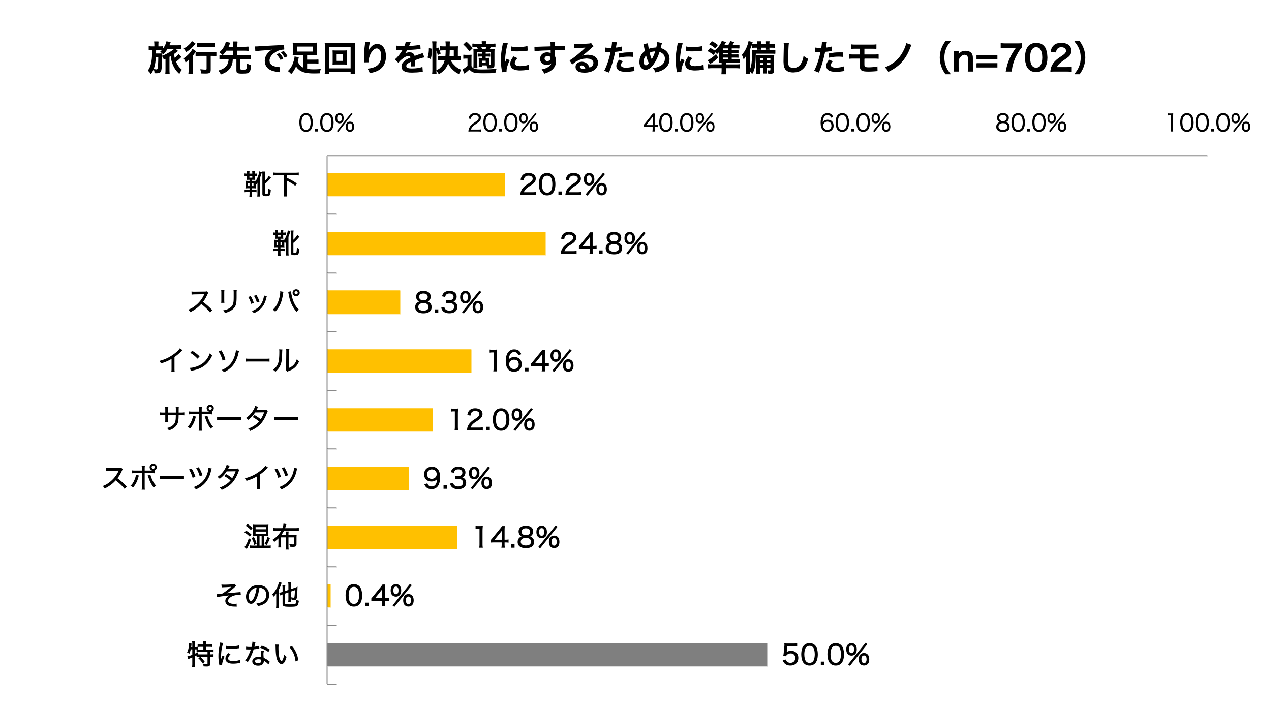旅行先での足回りを快適にするために準備したもの1位「靴」、2位「靴下」。今後の購入意向の2位に「インソール」がランクイン