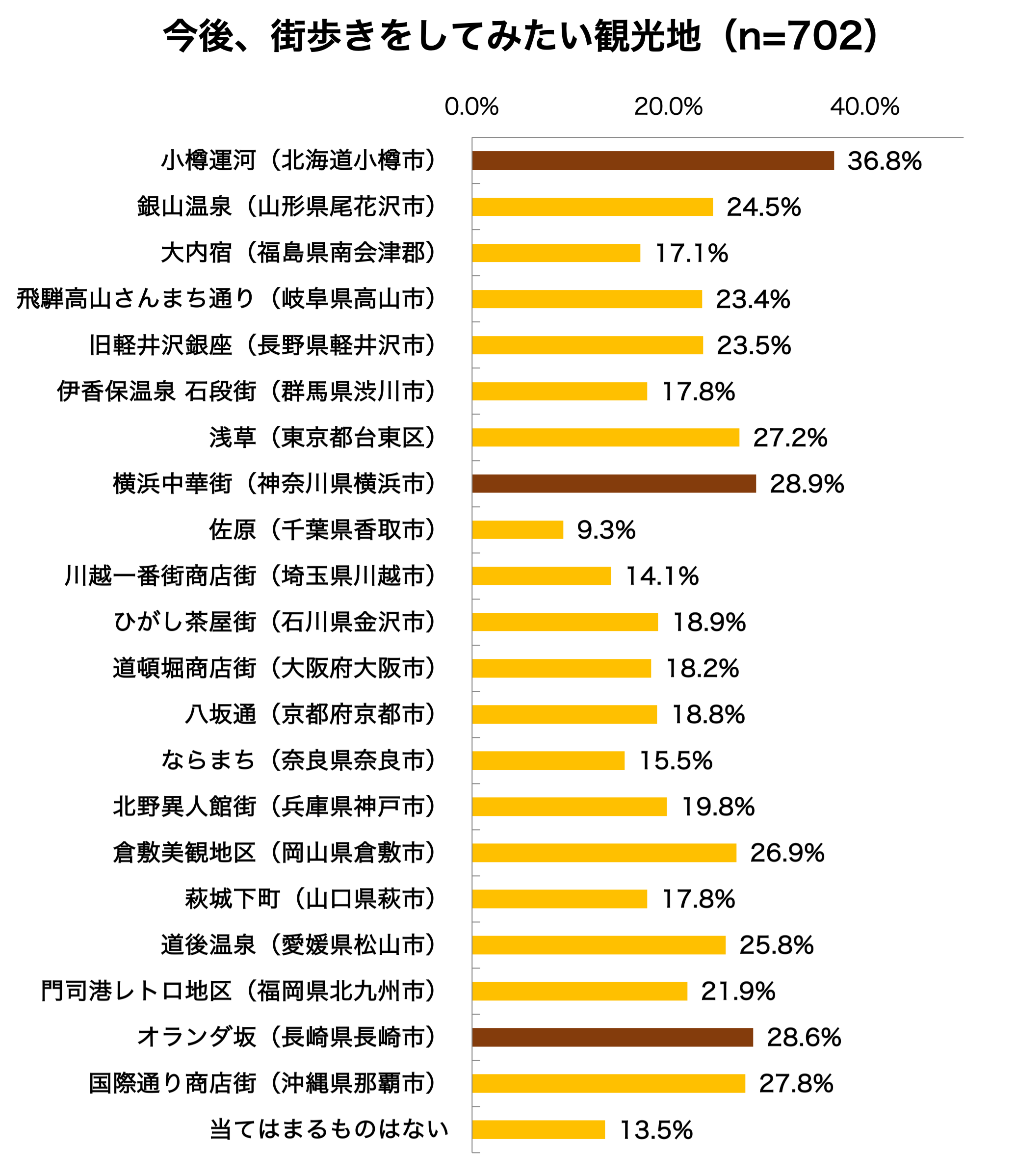 最後に、今後、街歩きをしてみたい観光地を尋ねたところ、1位「小樽運河(北海道小樽市)」(36.8%)、2位「横浜中華街(神奈川県横浜市)」(28.9%)、3位「オランダ坂(28.6%)が人気スポットとして支持を集めました。アフターコロナにおいては、景観の良さだけでなく、“食べ歩き”ができるエリアに人気が集まる傾向と言えそうです。