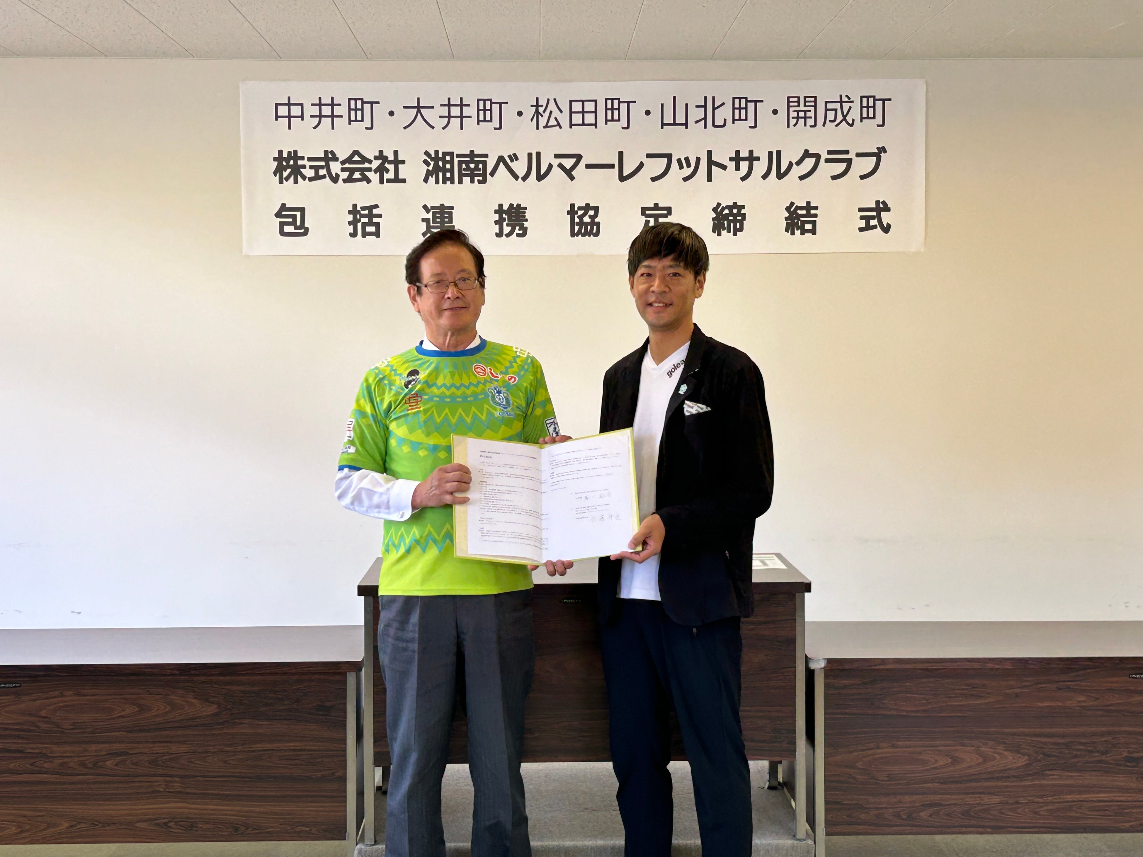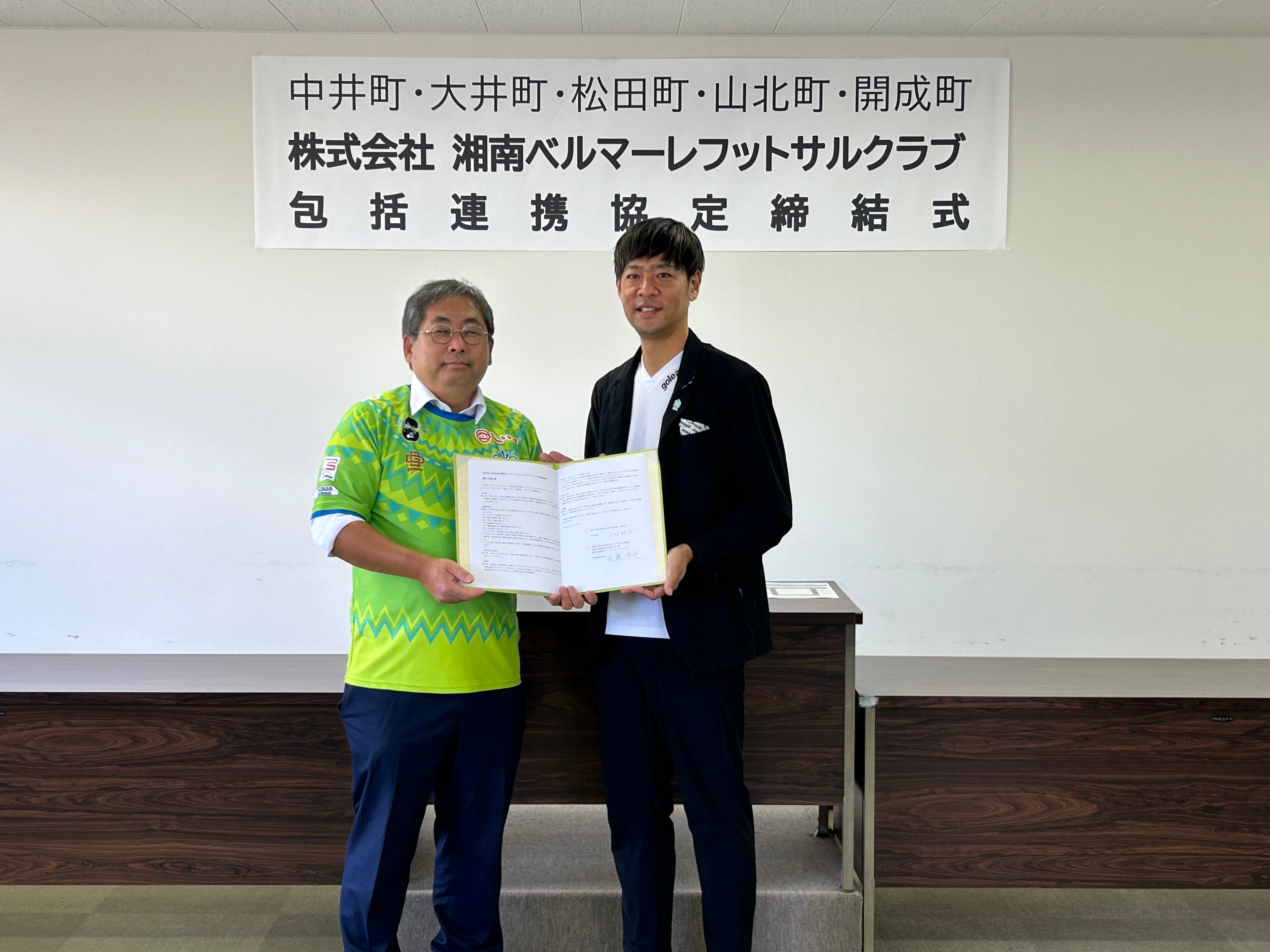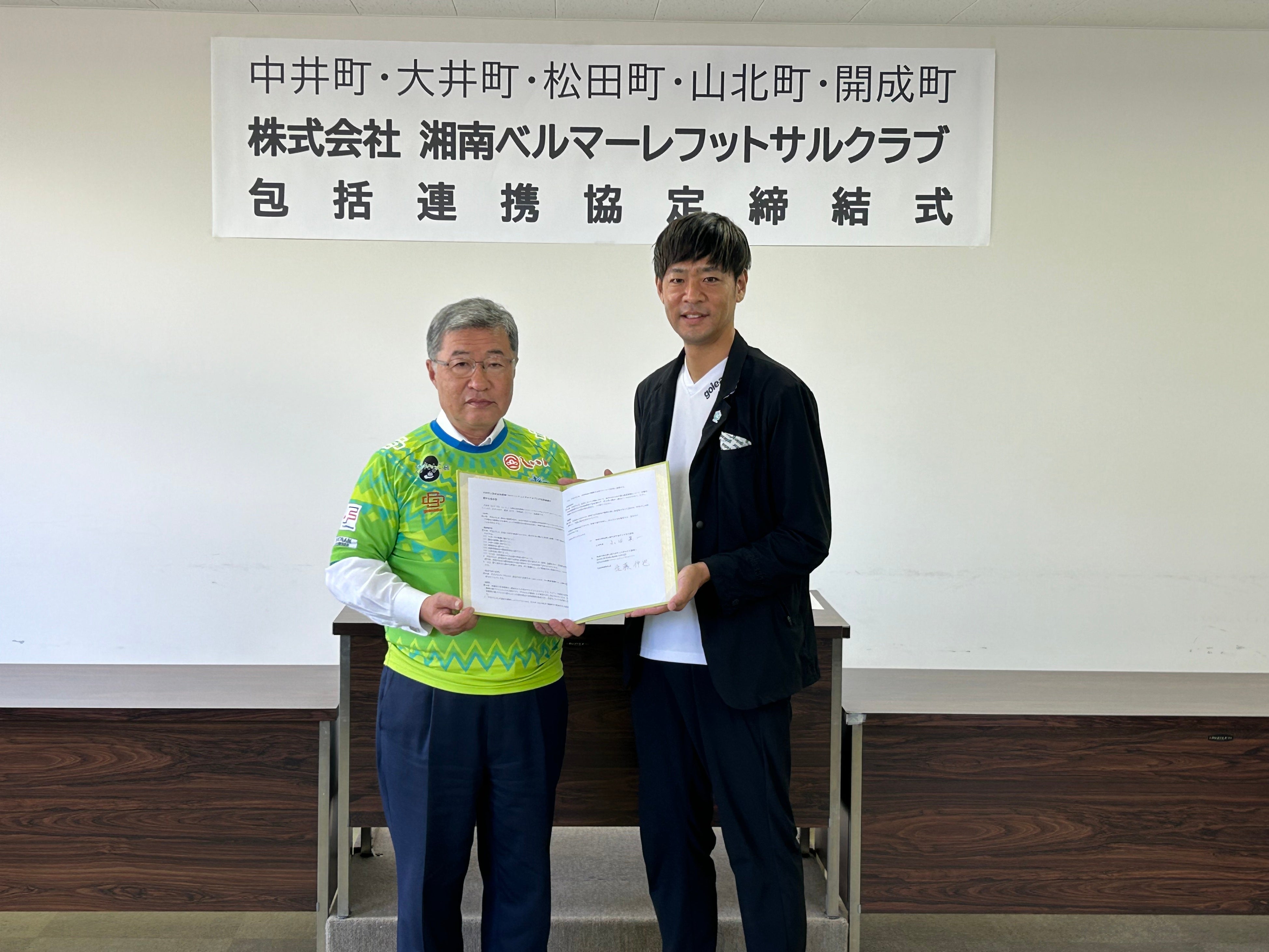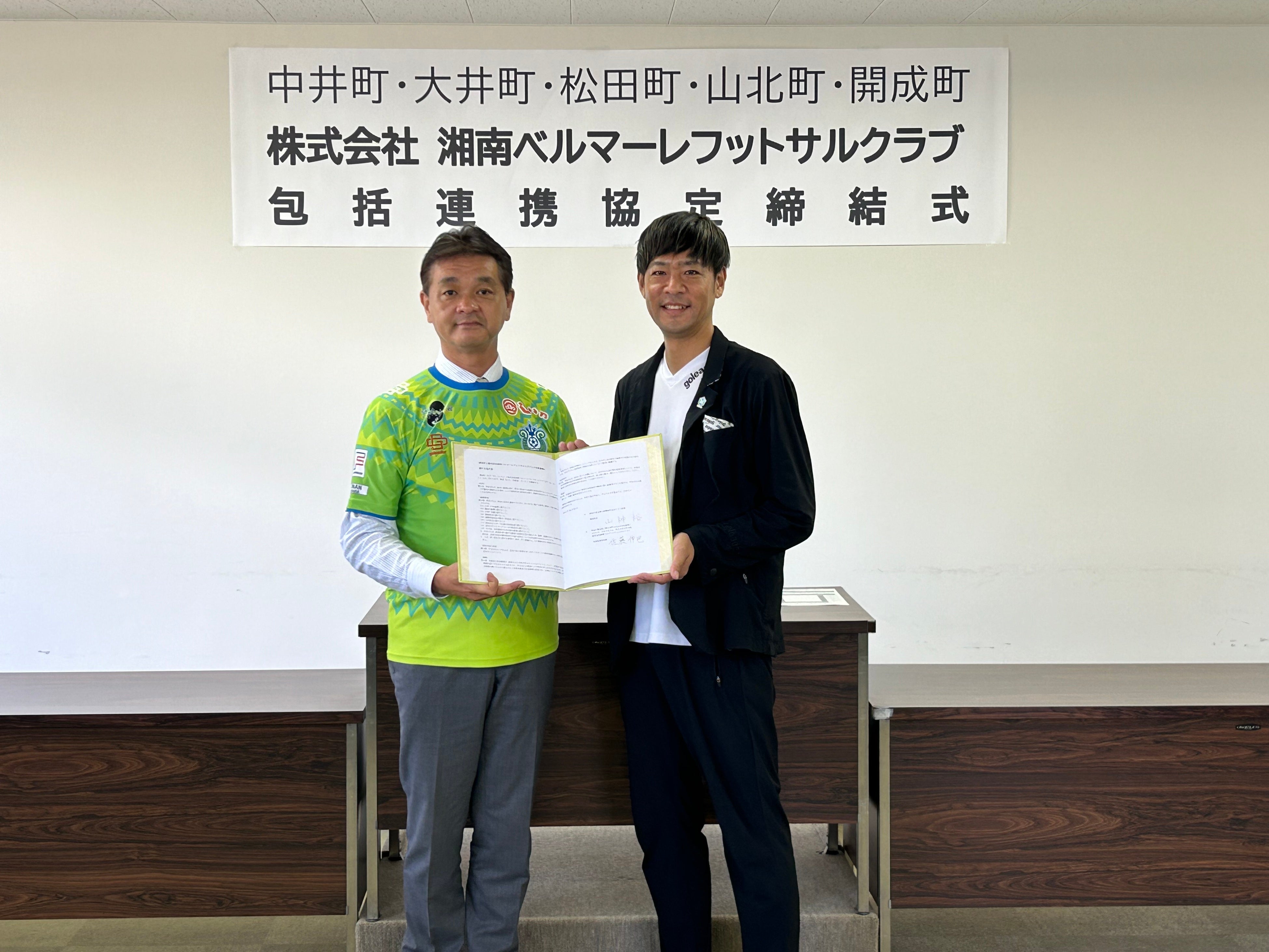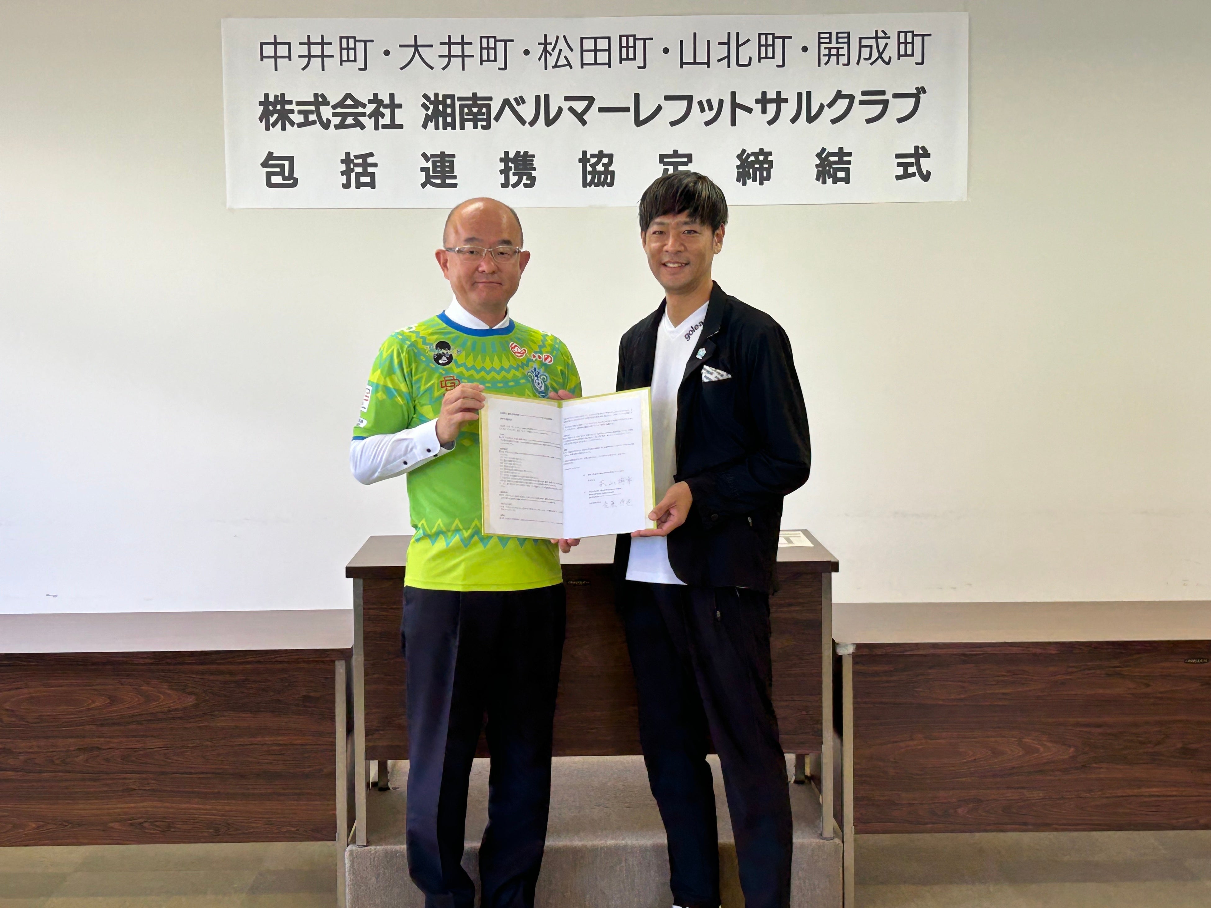 この度、株式会社湘南ベルマーレフットサルクラブは、足柄上郡5町の大井町、中井町、松田町、山北町、開成町と包括連携を締結することとなり、10月20日(金)に包括連携協定締結式を行いました。