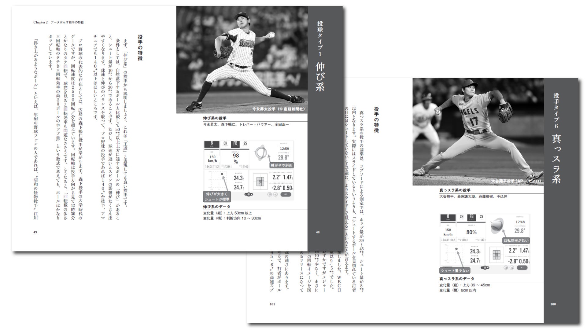 野球の競技人口が減る一方で、投手の平均球速が上昇傾向にある理由は、この分析機器の発展によると著者は語っています。本書では、こうした機器を通じてわかる、回転数・回転軸・回転効率といった要素を切り口に、球速・球質に迫っています。