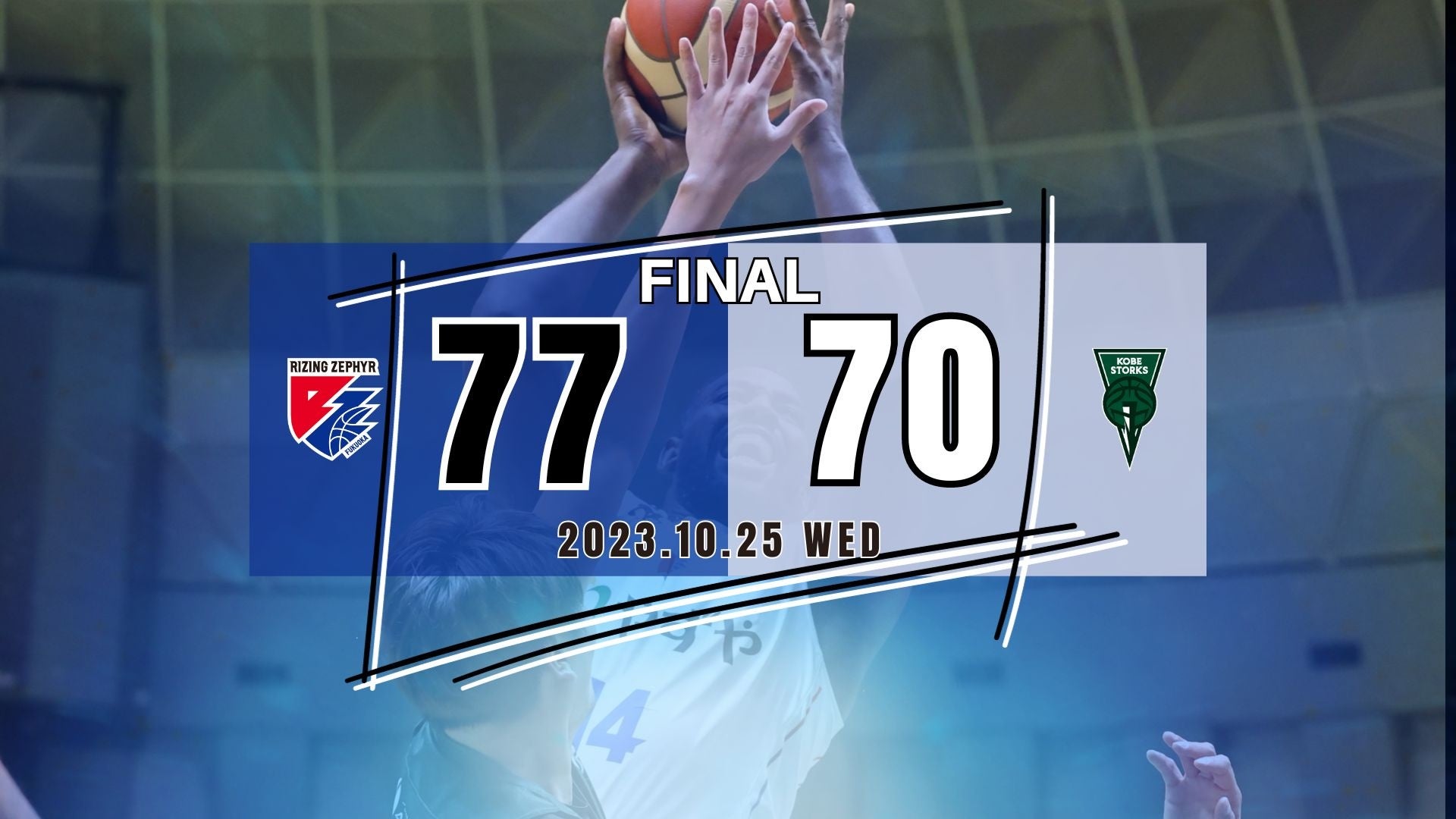 2023年10月25日(水)に開催されました【ライジングゼファーフクオカvs.神戸ストークス】において“福岡77-70神戸”の結果となりましたことお知らせいたします。