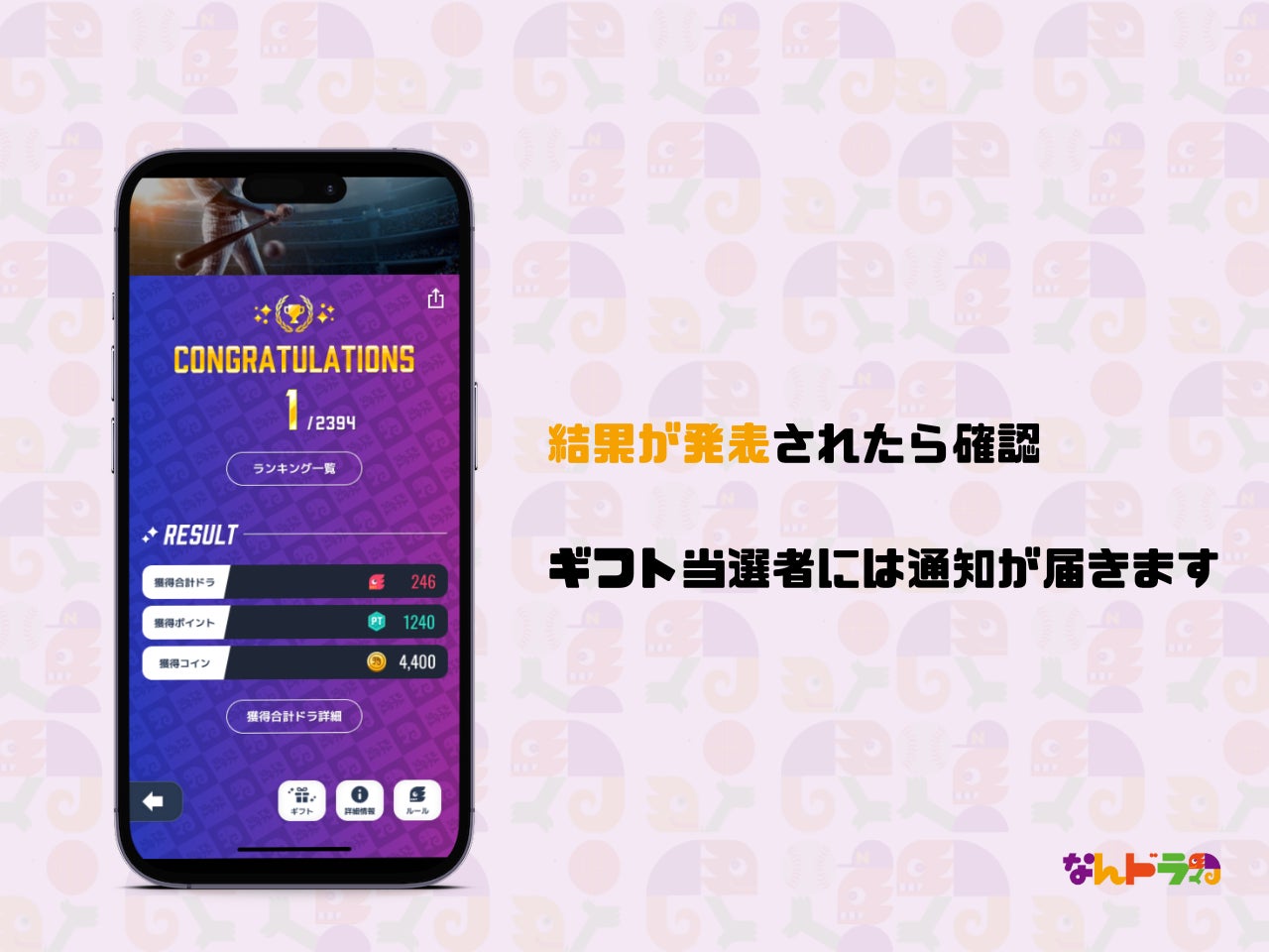 「なんドラ」はアプリケーションを利用し試合の勝敗や特定選手の活躍などを予想するサービスです。 予想結果に応じてポイントを獲得でき、週間ランキング上位ユーザーには様々なギフトをプレゼントしており、全国にいる利用者とランキング勝負を通してスポーツ観戦に新たな観戦価値と熱狂を提供します。