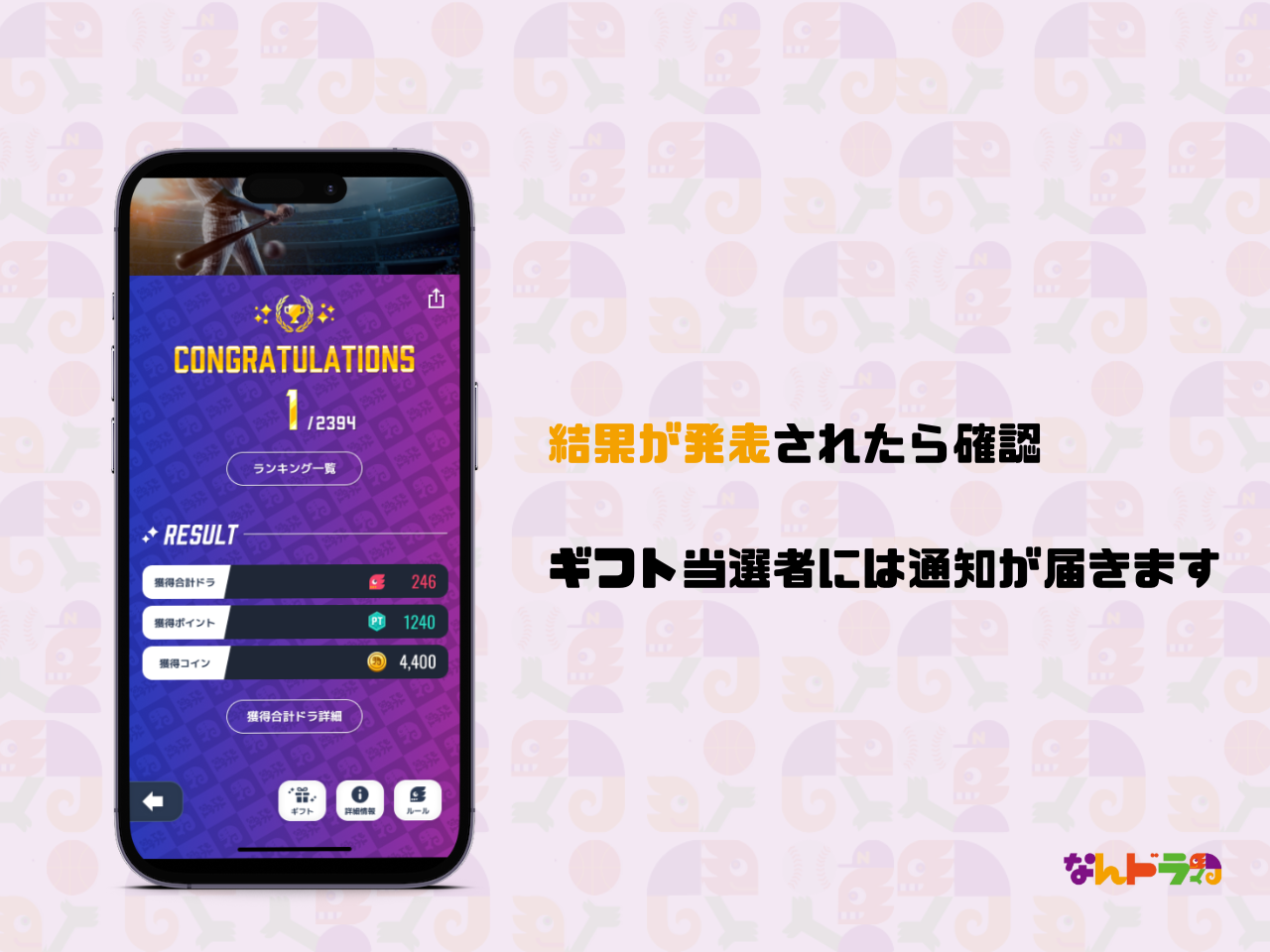 「なんドラ」はアプリケーションを利用し試合の勝敗や特定選手の活躍などを予想するサービスです。 予想結果に応じてポイントを獲得でき、週間ランキング上位ユーザーには様々なギフトをプレゼントしており、全国にいる利用者とランキング勝負を通してスポーツ観戦に新たな観戦価値と熱狂を提供します。