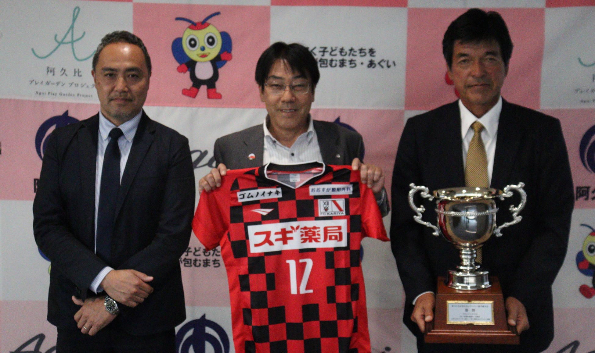 佐々木賢二代表取締役社長と今井雅隆監督が10月27日(金)阿久比町役場へ訪問し、第59回全国社会人サッカー選手権大会で優勝したことをホームタウン阿久比町の田中清高町長に報告いたしました。