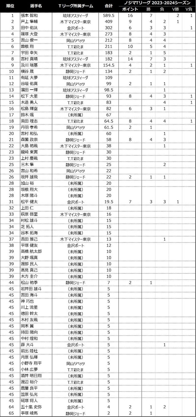 ノジマTリーグ 2023-2024シーズンにおける、「2024パリオリンピックシングルス選考ポイント 」の獲得状況をお知らせします。(ノジマTリーグ 2023-2024シーズン公式戦 10/29開催試合終了時)