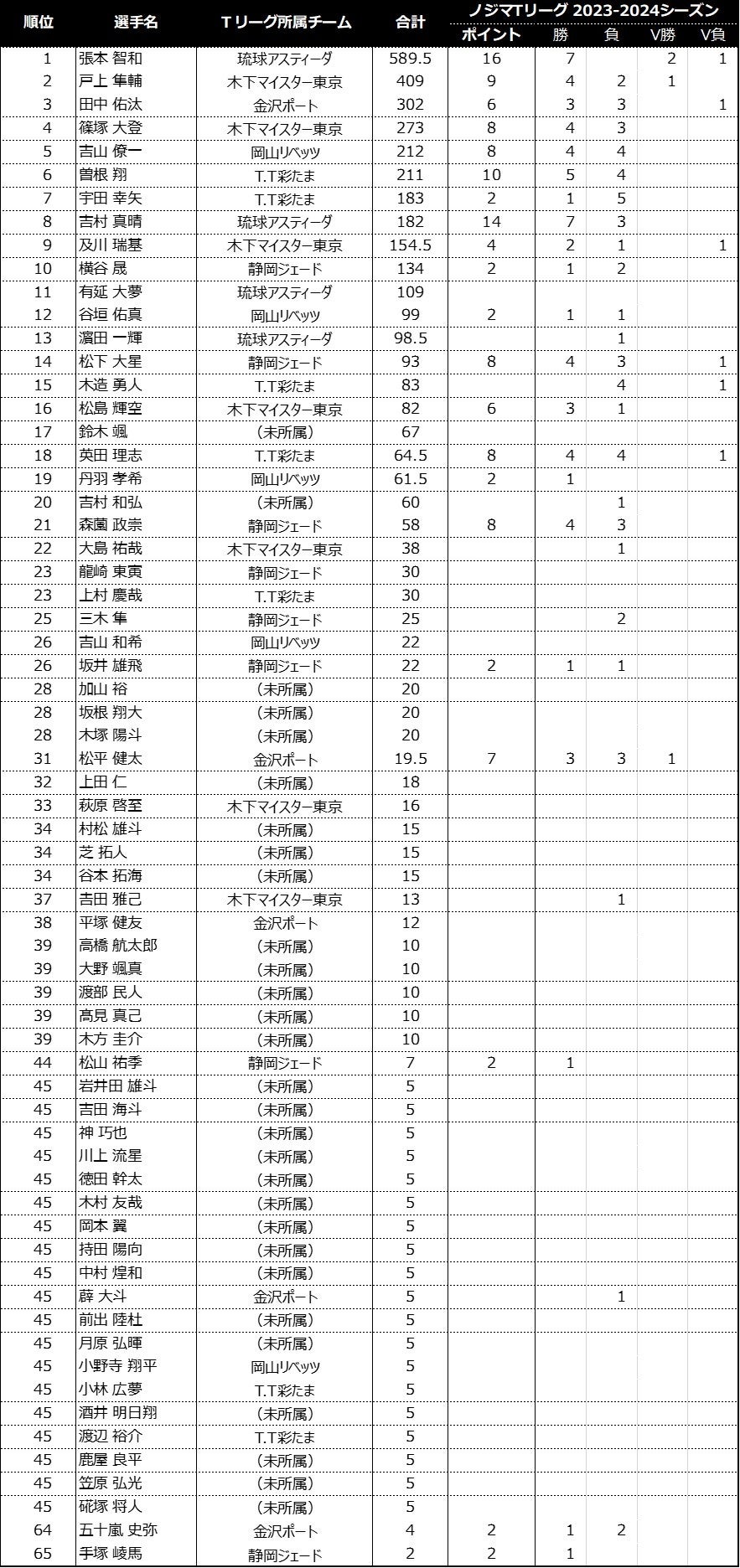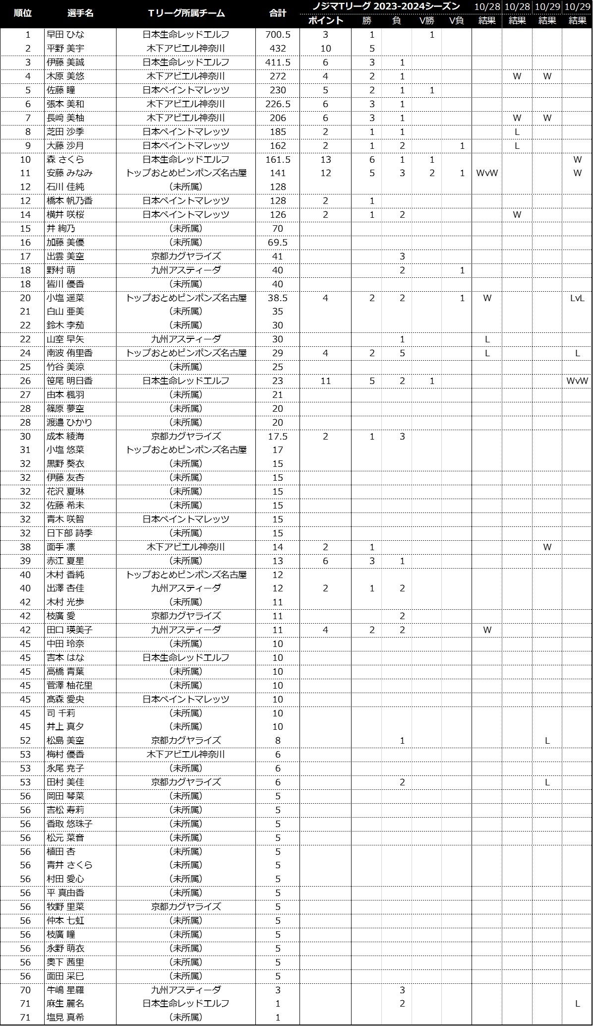 ノジマTリーグ 2023-2024シーズンにおける、「2024パリオリンピックシングルス選考ポイント 」の獲得状況をお知らせします。(ノジマTリーグ 2023-2024シーズン公式戦 10/29開催試合終了時)