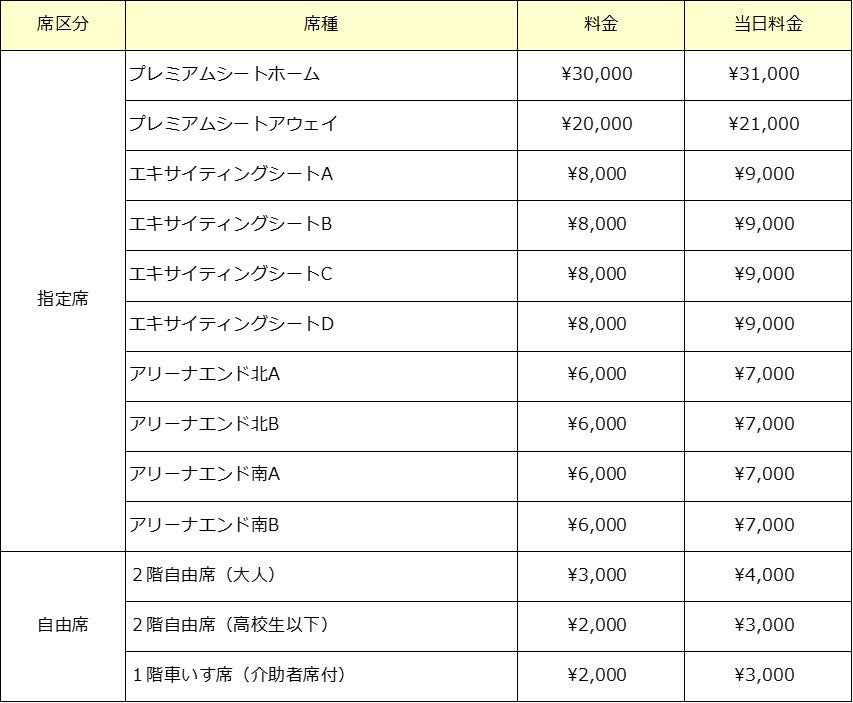 ・お付き添いの方はパイプ椅子でのご観戦となります。また同伴者が2名以上の場合は同様の席種をご購入ください。