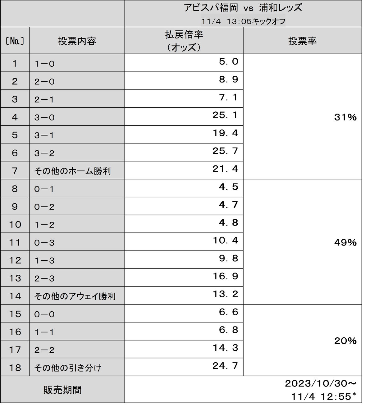 「WINNERサッカー1試合予想(アビスパ福岡 vs 浦和レッズ)」の投票状況(11月2日(木)10時時点)