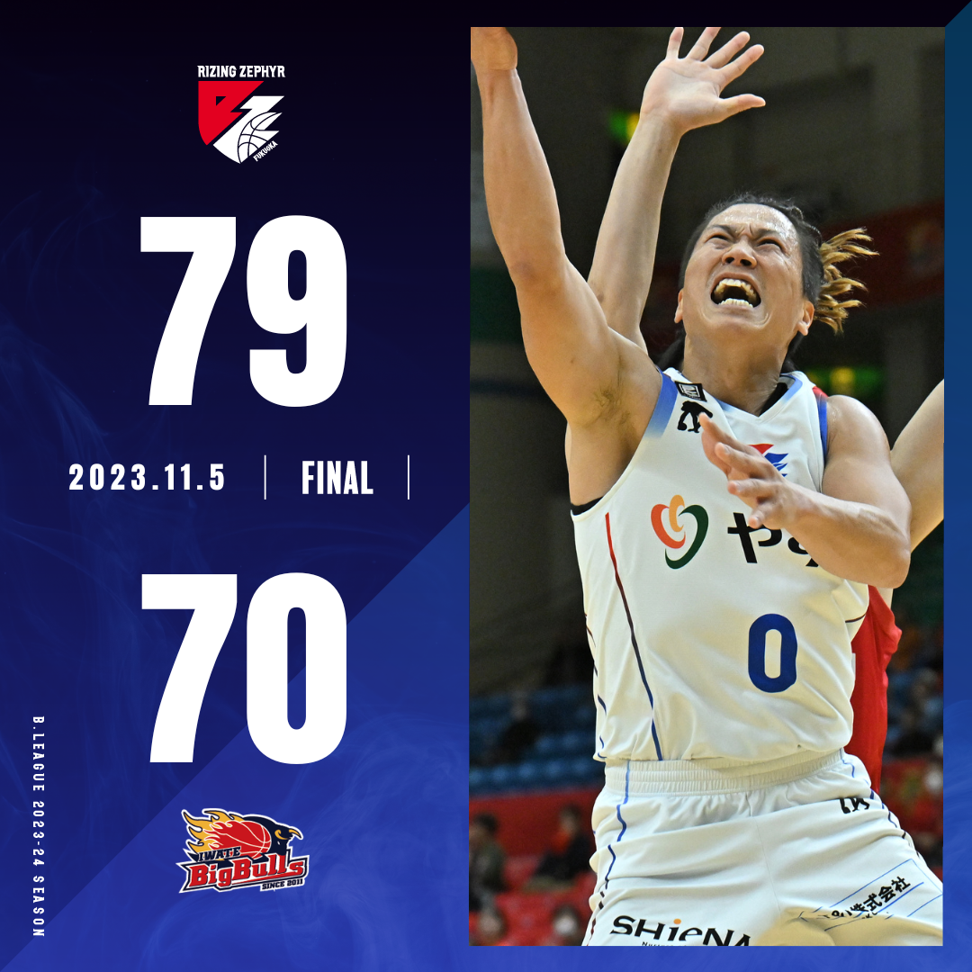 2023年11月4日(土)に開催されました【岩手ビッグブルズvs.ライジングゼファーフクオカ】において“岩手70-79福岡”の結果となりましたことお知らせいたします。