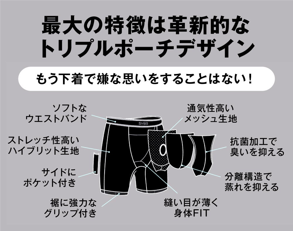 【トリプルポーチデザイン】股間部分の蒸れと摩擦を解消し、快適な履き心地を。