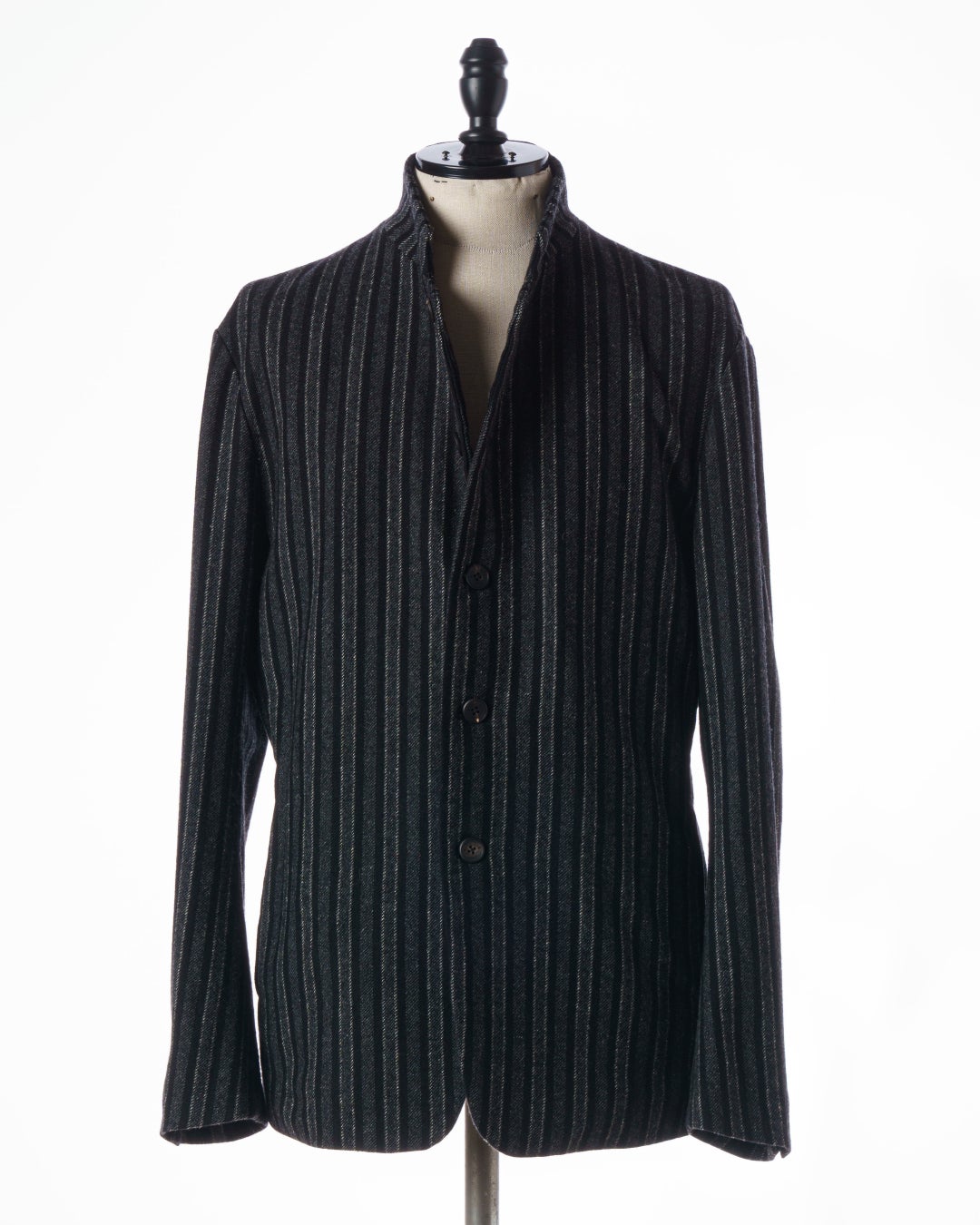 wjkの定番アイテムであるテーラードジャケット。よりカジュアルな装いを意識した、新型「sack jacket」を提案。 ウールの一大産地として名高い尾州一宮産のウールにwjk独自のパターンのストライプを施した別注素材を作製。