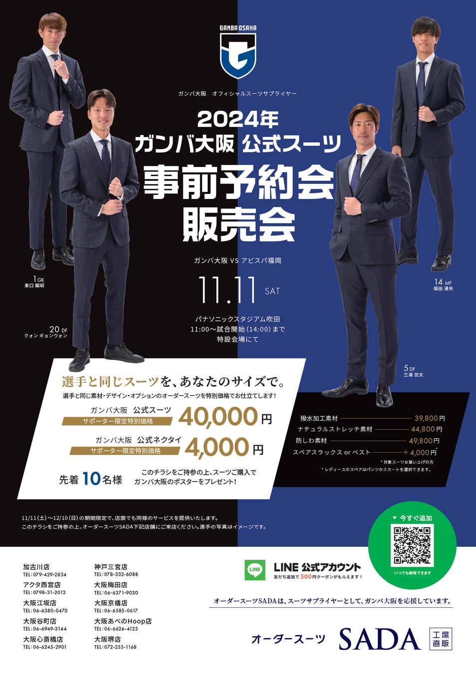 株式会社オーダースーツ SADA(本社:東京都千代田区、代表取締役社長:佐田展隆)は、2023 年 11 月 11 日(土)にガンバ大阪オフィシャルスーツの予約販売会を、11:00~試合開始(14:00)まで パナソニックスタジアム吹田 特設会場にて開催いたします。オーダースーツ SADA は、オフィシャ ルスーツサプライヤーとしてガンバ大阪を応援しています!