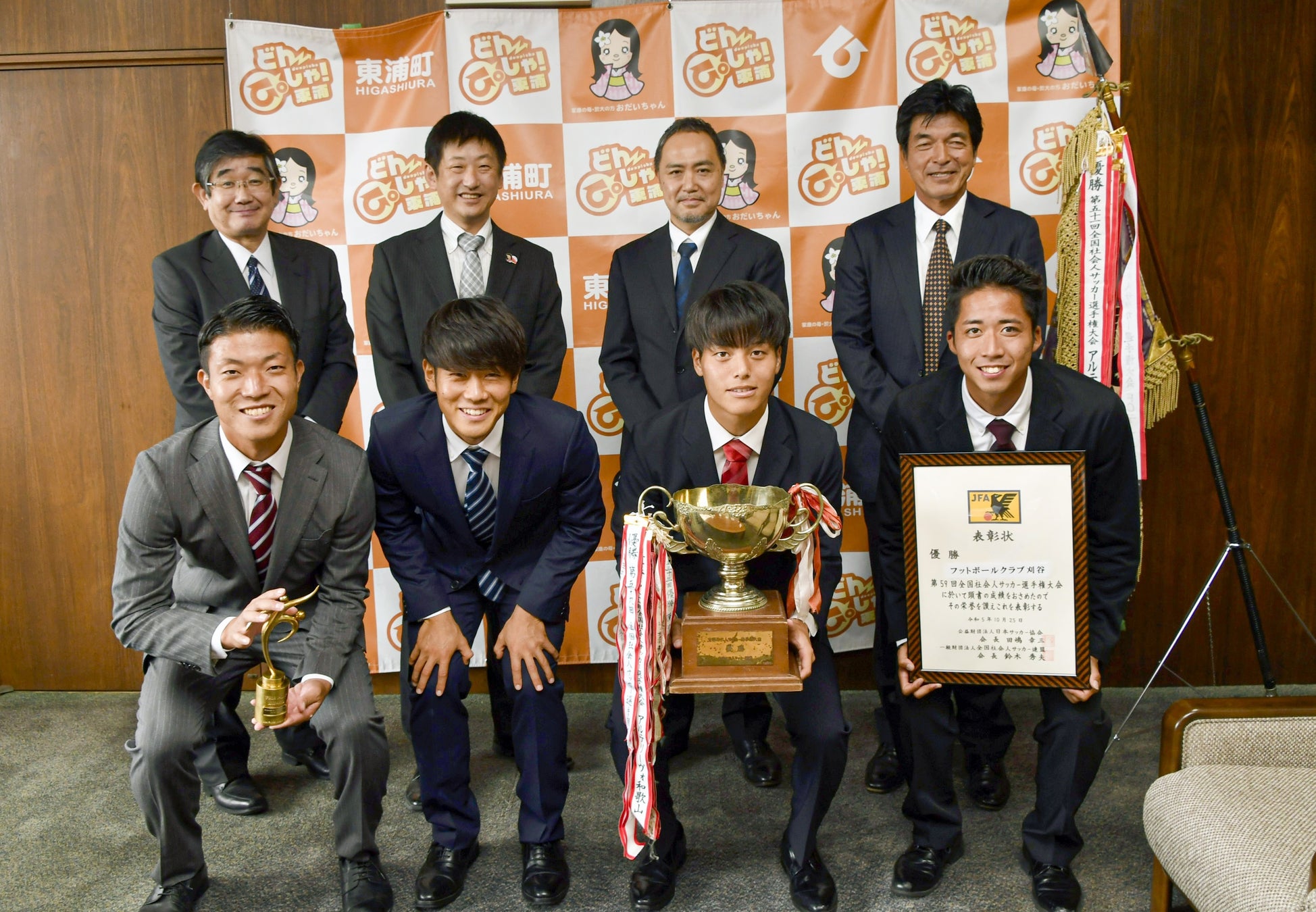 佐々木賢二代表取締役社長と今井監督と尾﨑僚選手と鈴木直人選手と園田新一郎選手と西川公章選手が11月7日(火)東浦町役場へ訪問し、第59回全国社会人サッカー選手権大会で優勝したことをホームタウンである東浦町の日髙輝夫町長に報告いたしました。