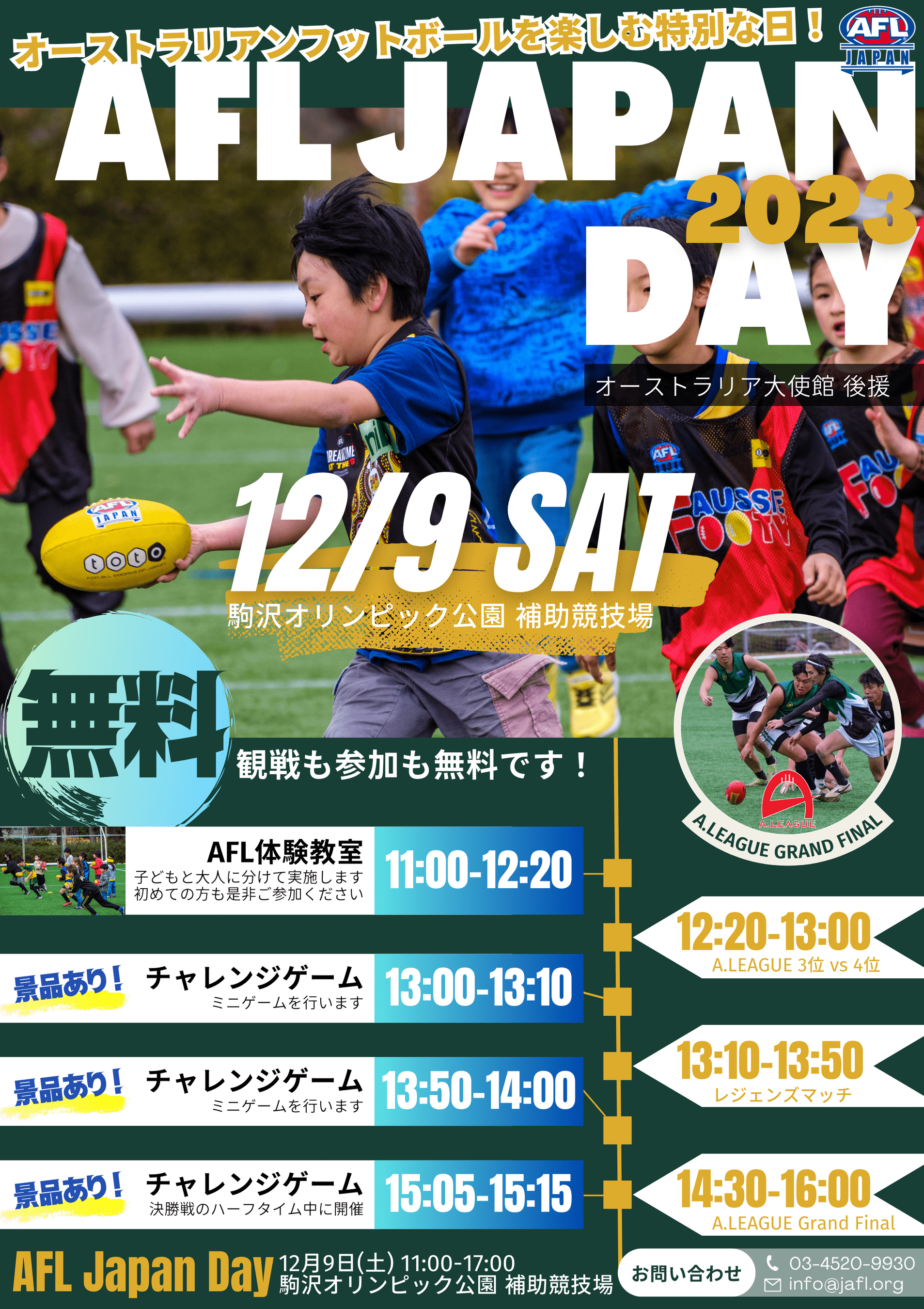 関東圏4クラブで開催されているA.LEAGUEの決勝戦に合わせて開催されるAFL JAPAN DAYは初めてオーストラリアンフットボールに触れる方も、オーストラリアンフットボールをすでに知っている方も楽しめるイベントです。