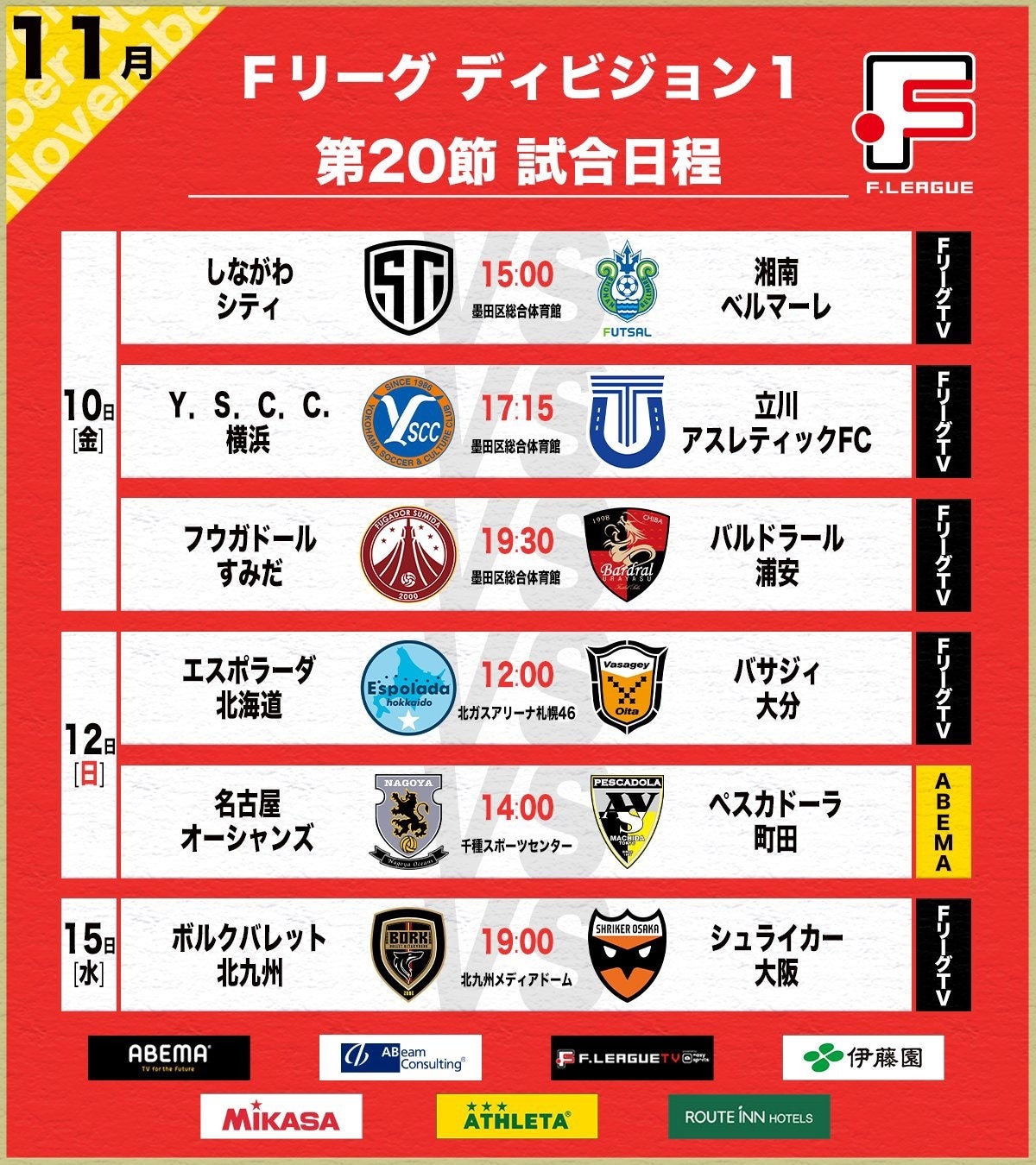 11月12日(日)14:00キックオフ 名古屋オーシャンズ vs. ペスカドーラ町田