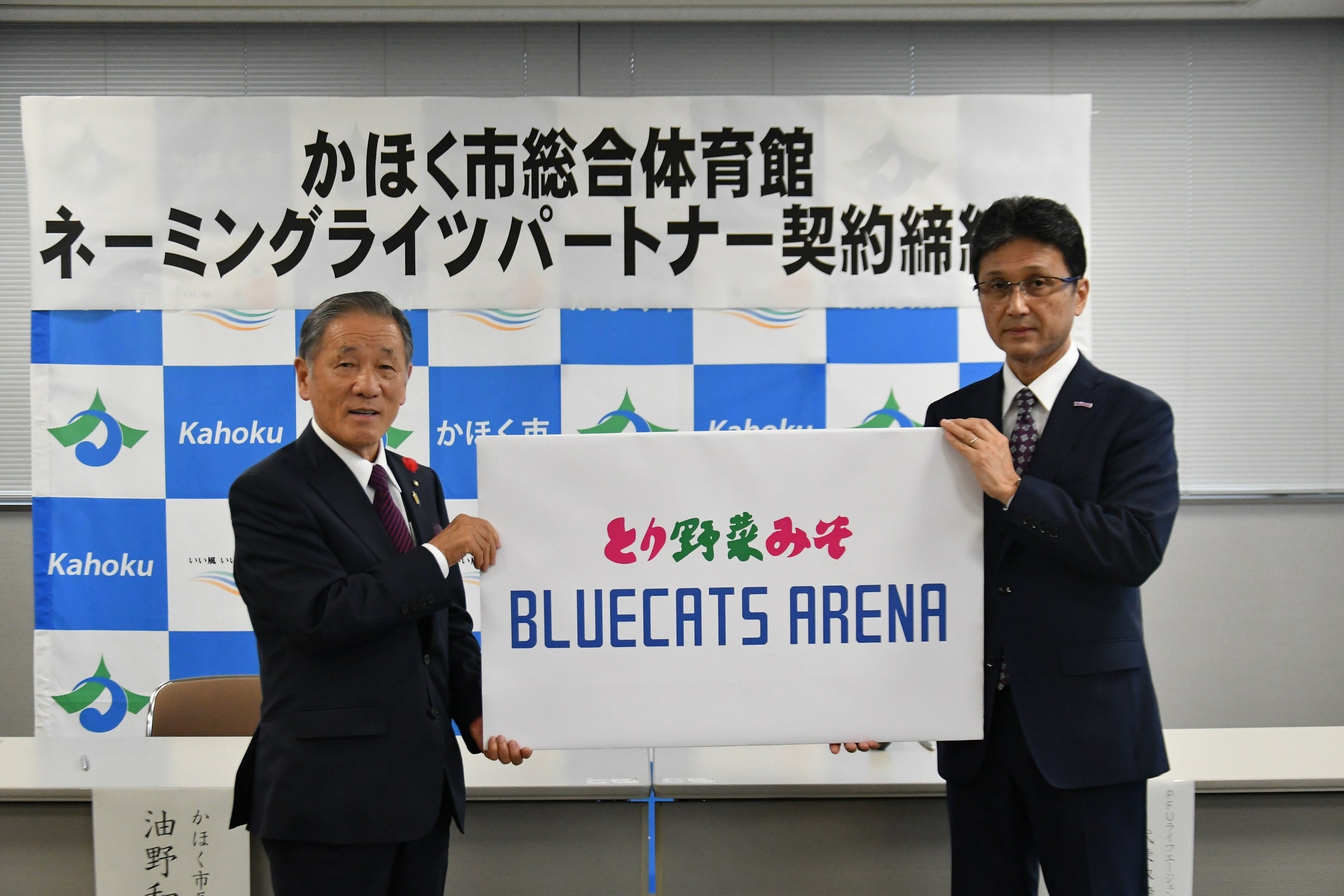 PFUブルーキャッツを運営する「PFUライフエージェンシー株式会社」(所在地:石川県かほく市、代表:蓮池学)は、本日、かほく市(市長: 油野 和一郎)とかほく市総合体育館のネーミングライツパートナー契約(以下、本契約)を締結いたしました。