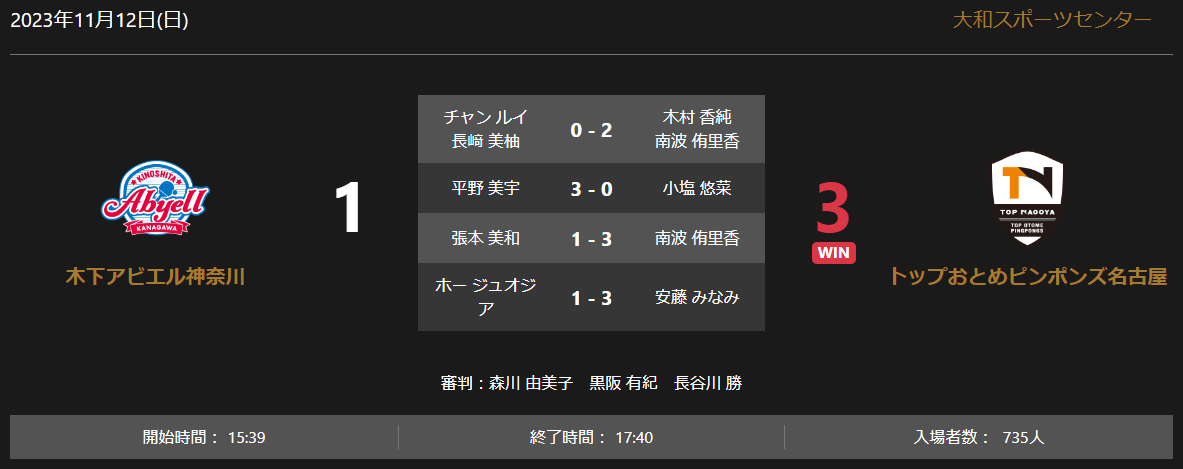 ホームプレスリリース ノジマTリーグ 2023-2024シーズン 公式戦 11月12日開催 木下アビエル神奈川vsトップおとめピンポンズ名古屋試合結果 2023年11月12日 21時06分 公開|スポーツマニア編集部プレスリリース 一般社団法人Tリーグのプレスリリース 木下アビエル神奈川とトップおとめピンポンズ名古屋の試合は、3-1でトップおとめピンポンズ名古屋が勝利しました。