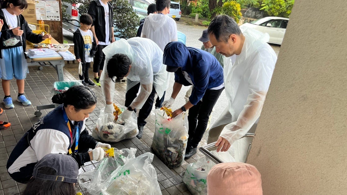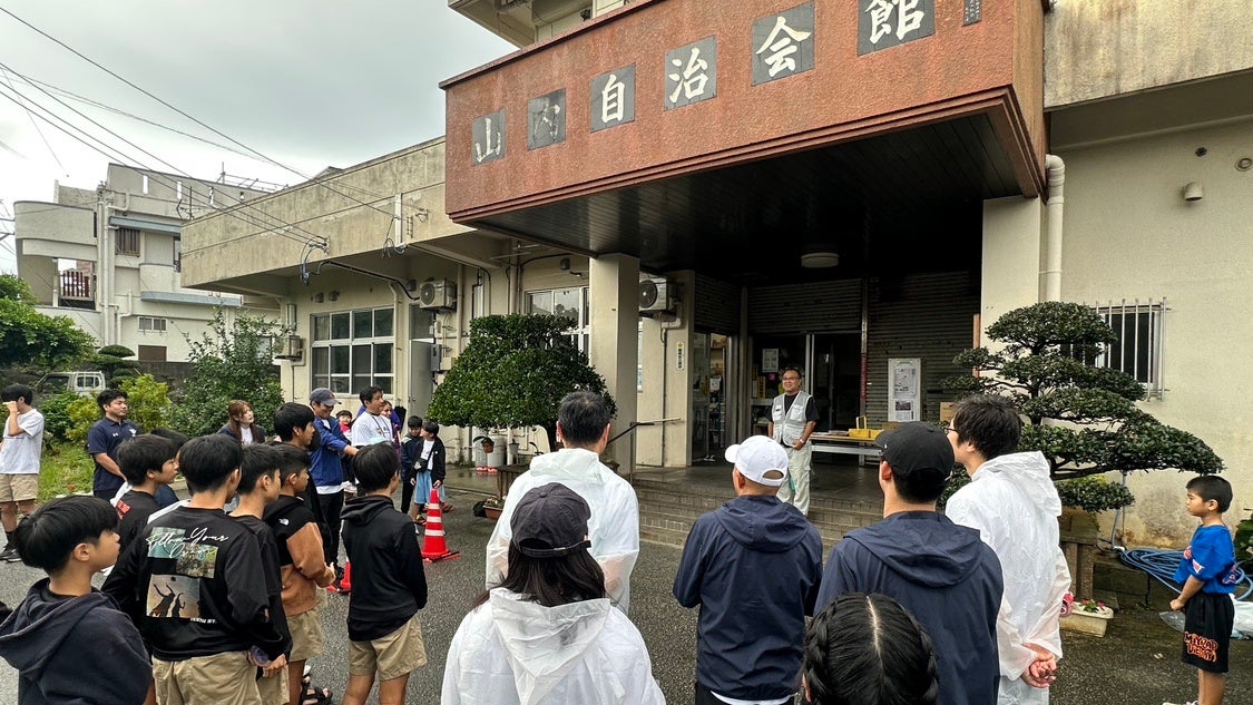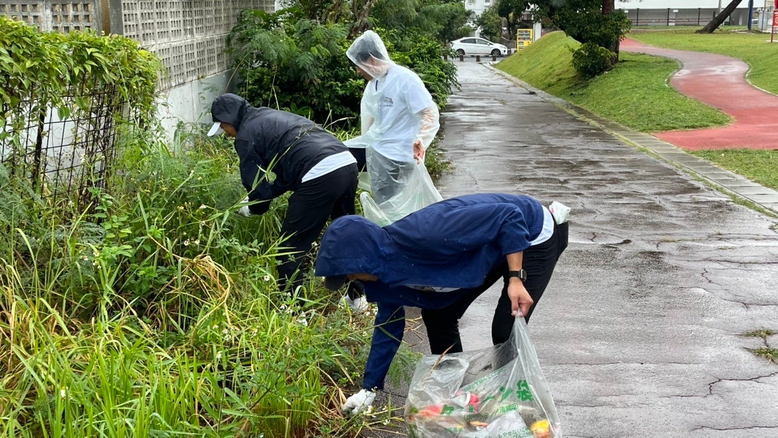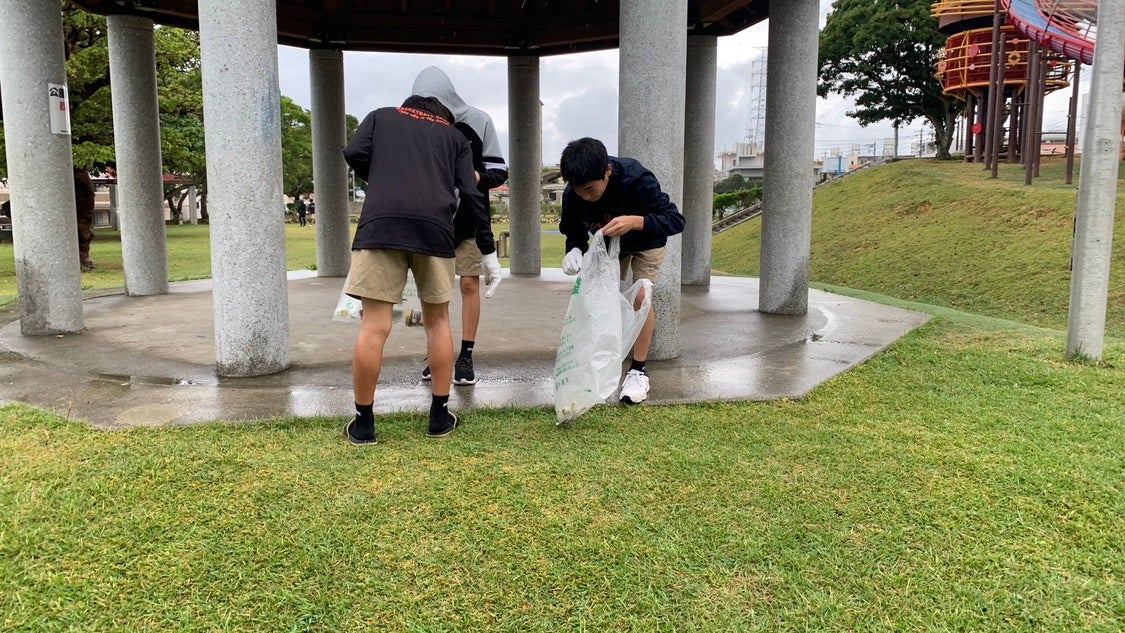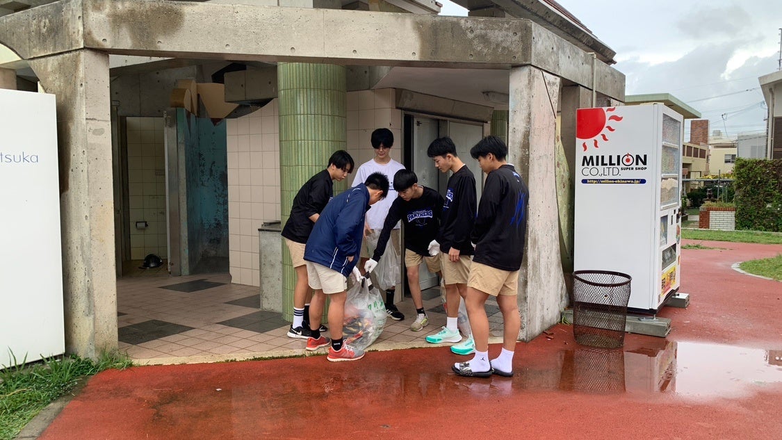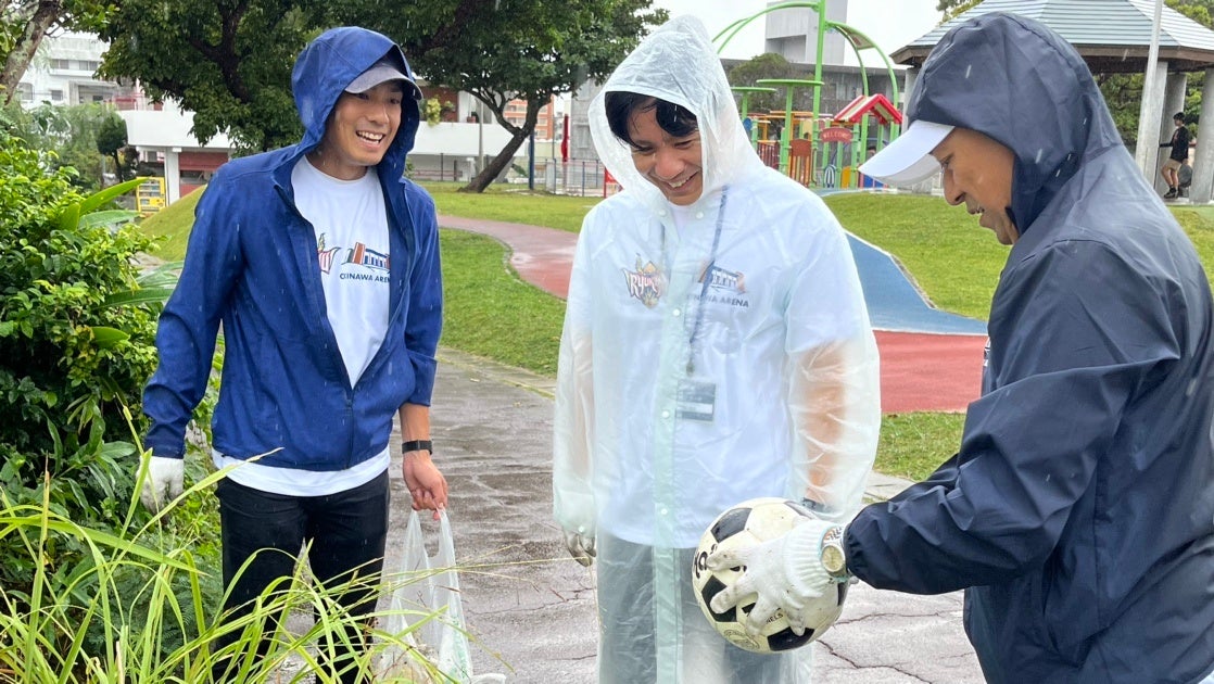 当日は小雨が降る中ではありましたが、限られた時間の中、地域の皆さまと交流を図りながら、沖縄アリーナが位置する沖縄市山内地区の美化活動を行いました。