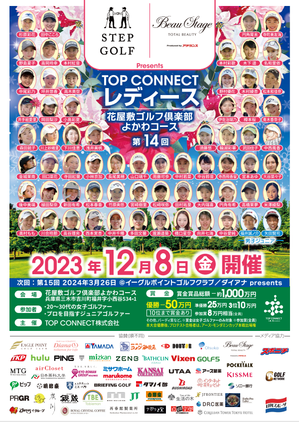 華やかな女子プロゴルファーたちは常に注目を集めていますが、試合に出場できる選手はごくわずか。さらにプロテストは年に1度、合格者はわずか20名と、プロへの道のりは厳しく狭き門です。そんな現状を受け、TOP CONNECT では、ツアーへの出場権を得られない女子プロ予備軍を応援する目的で『TOP CONNECT レディース』を全13回手掛けてきました。これまでの開催地は茨城県や千葉県といった関東圏内のみでしたが、第14回目となる今大会は初の試みとして関西で開催いたします。