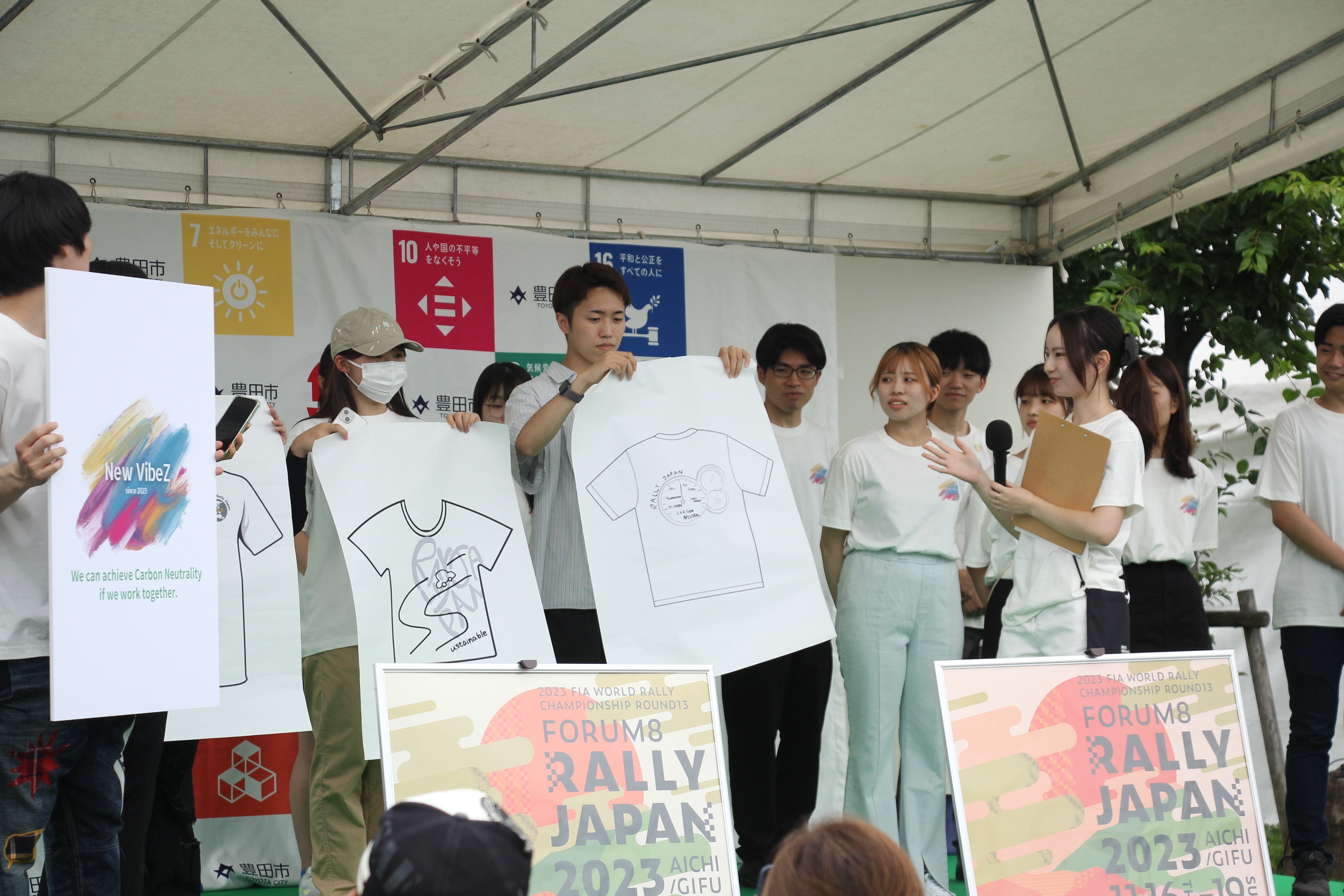 この度、本協定の一環として、フォーラムエイト・ラリージャパン2023に向けて学生の方々がオリジナルでデザインした図柄を、豊島が展開する国内最大級のオーガニックコットン普及プロジェクト「ORGABITS(オーガビッツ)」のオーガニックコットン100%のTシャツに施した限定Tシャツを制作しました。採用されたデザインは学生らの4~5種類の提案から選ばれ、サスティナブル(Sustainable)の頭文字「S」をミライに続く「道」に見立てたデザインになっています。本Tシャツは2023年11月16日(木)~11月19日(月)の期間、豊田市駅前東口まちなか広場と、豊田スタジアム「RALLY JAPAN OFFICIAL SHOP」にて、200枚限定で販売されます。