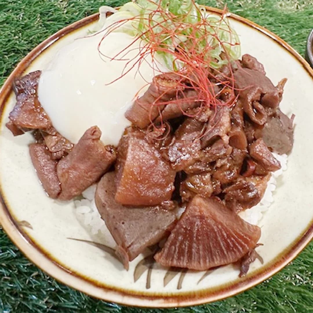 たっぷりの牛すじと豚ホルモンのどて煮をご飯に乗っけました。温泉卵、鶏皮カレーチップス付き