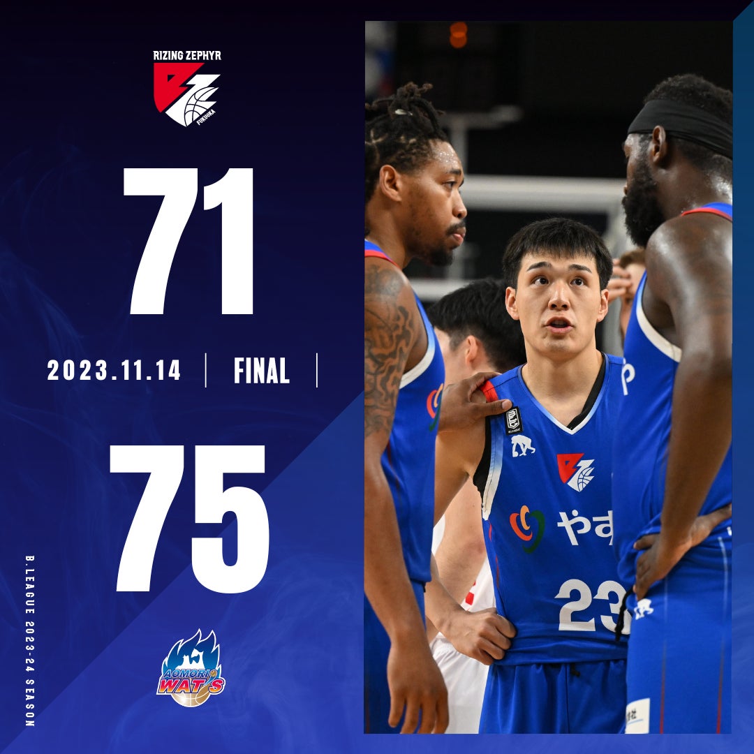 2023年11月14日(火)に開催されました【ライジングゼファーフクオカvs.青森ワッツ】において“福岡71-75青森”の結果となりましたことお知らせいたします。