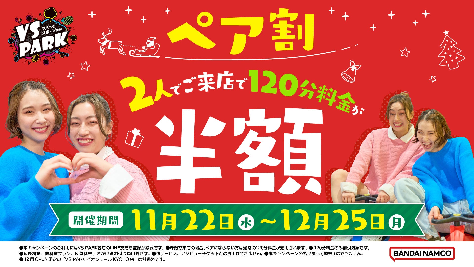 株式会社バンダイナムコアミューズメントが運営する屋内“ヤバすぎ”アクティビティ施設『VS PARK』では、2023年11月22日(水)から12月25日(月)までの期間、誰でも2人で来店すると1人あたりの料金がそれぞれ半額になる「ペア割」を実施します※。