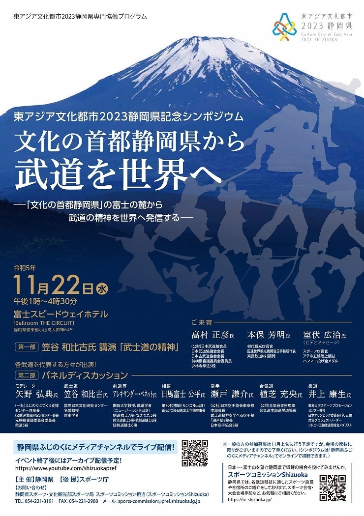 各武道を代表する第一人者が富士の麓に一堂に会し、武道の精神を世界へ発信するシンポジウムを開催します。