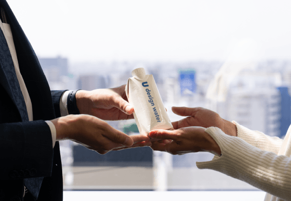 富永貿易株式会社は、2022年11月に120本からオリジナルラベルのデザインが可能な紙パックのナチュラルウォーターとして「U design water」のサービスを開始しました。環境負荷の小さい紙パックでのオリジナルラベルの実現のために、お客様ご自身でデザインされた21mm×93mmのラベルを紙パックに貼付してお届けしています。