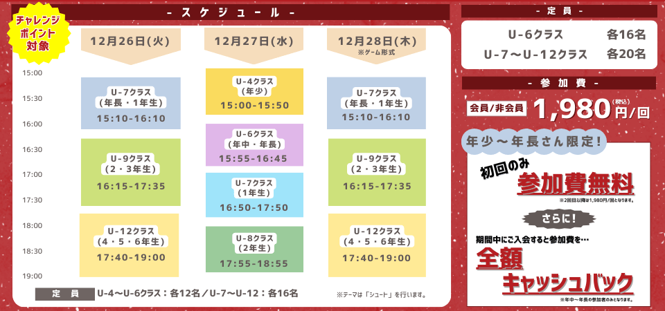 ・U-4クラス~U-6クラス(年少~年長):各12名