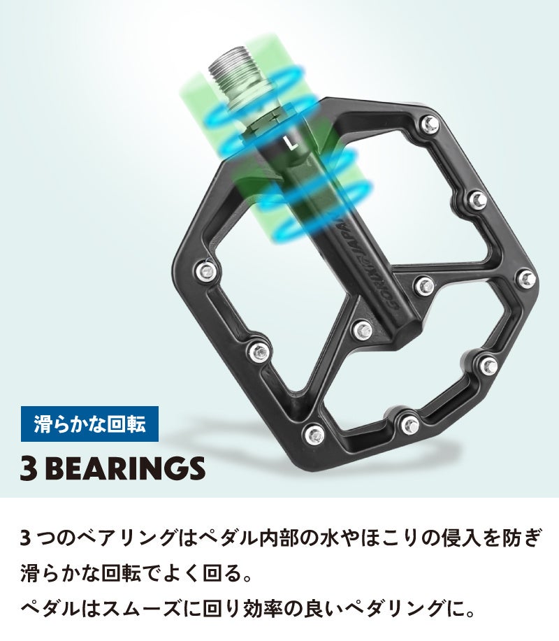 ペダルには3つのベアリングが搭載されており、滑らかな回転を実現します。