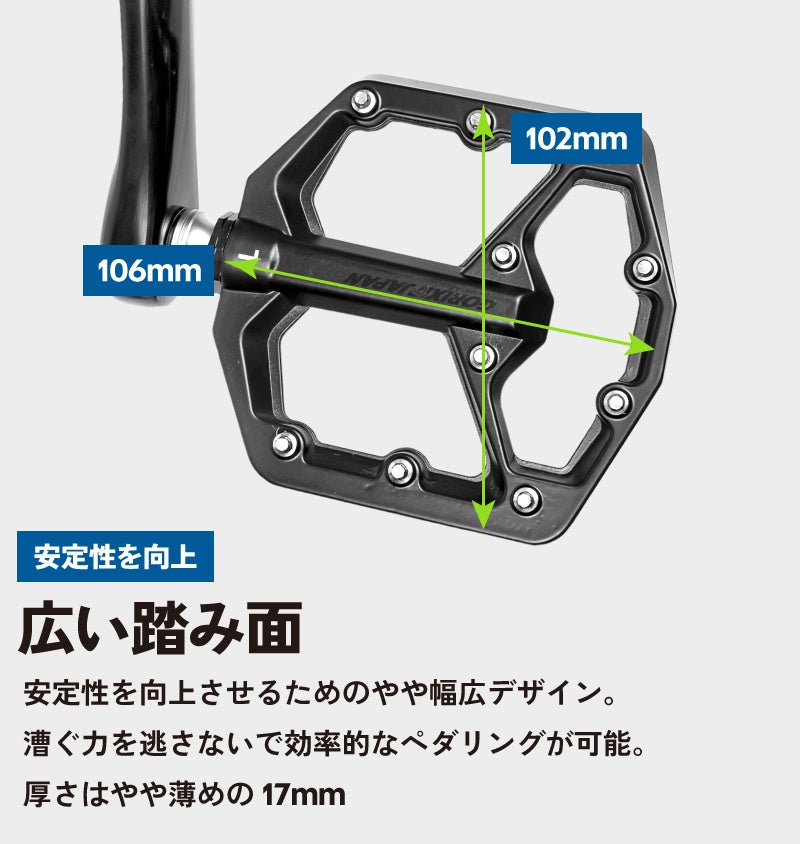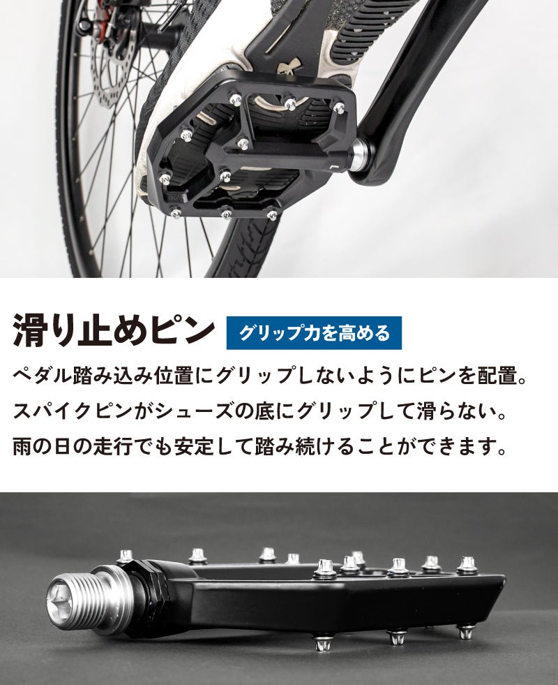 さらに、ペダル表面にはグリップ力を高める突起した滑り止めピンがあり、