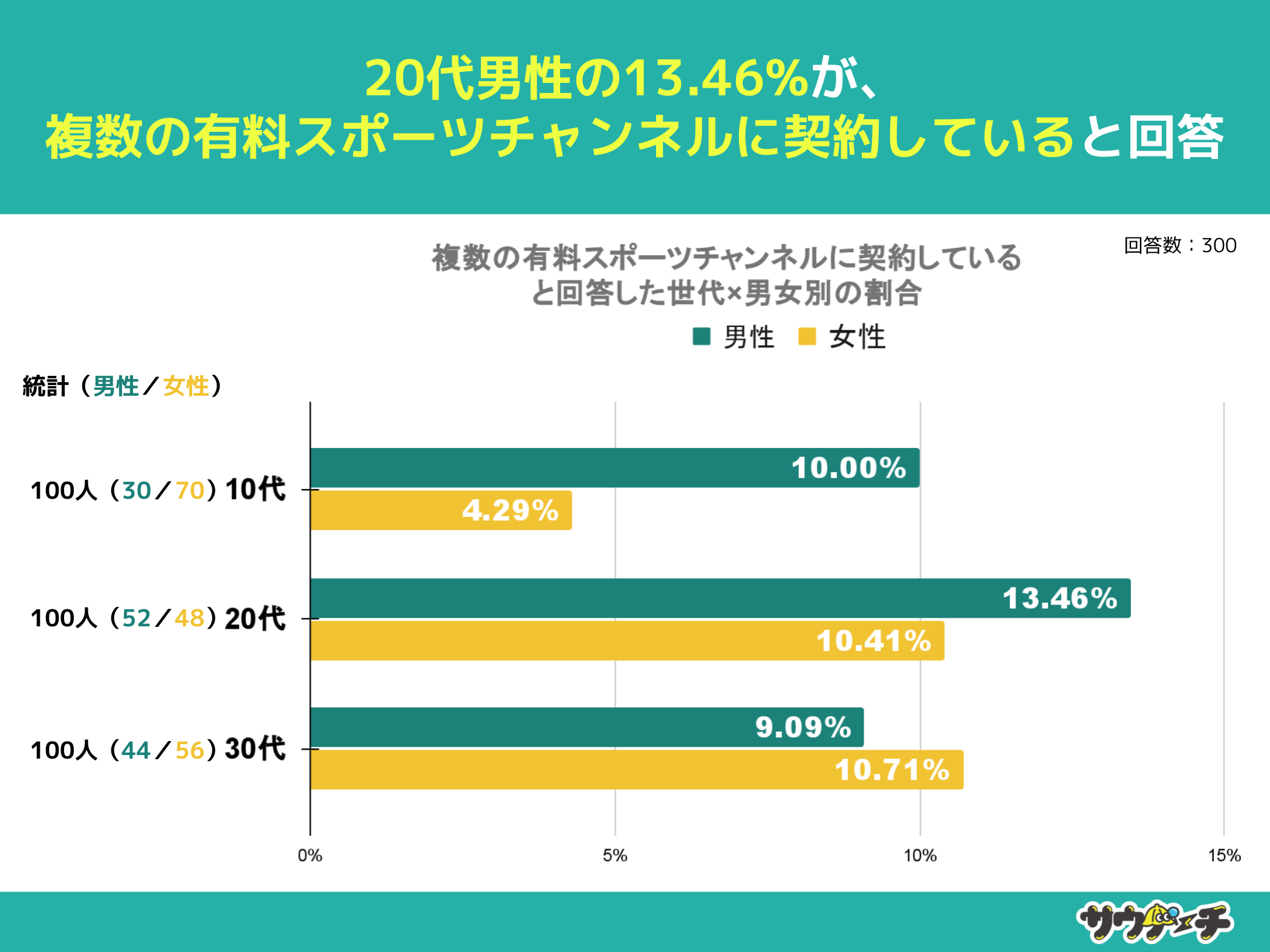【20代男性の13.46%が、複数の有料スポーツチャンネルに契約していると回答】