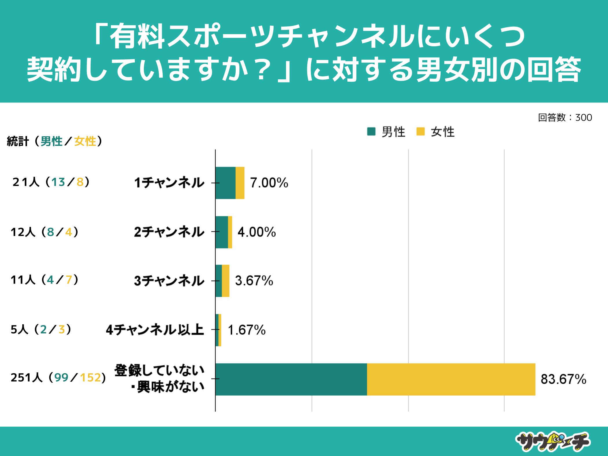 10代〜30代男女を対象とした『有料スポーツチャンネルにいくつ契約していますか?』というアンケートで、最も多かった回答は「登録していない・興味がない」で83.67%でした。