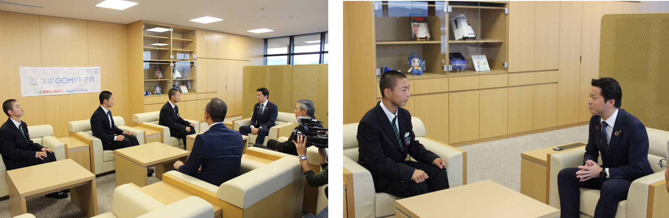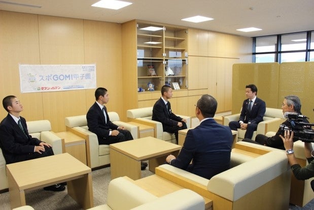 「島根県大会で皆さんは野球部1年生のメンバーで結成されたチームということで、野球と競技は違っても、日ごろ培ったチームワークと拾うごみの種類や集め方といった頭脳プレーで、みごと全国大会への切符を手にされました。全国の舞台での貴重な経験は、皆さんの人生の糧になると確信しています。松江市民みんなが応援しています。皆さんにとって「最高の甲子園」になることを心より願い、私からのエールとさせていただきます。行ってらっしゃい!そして、また優勝した際には来てください」という市長の言葉にチャンピオンチームの笑顔が溢れました。
