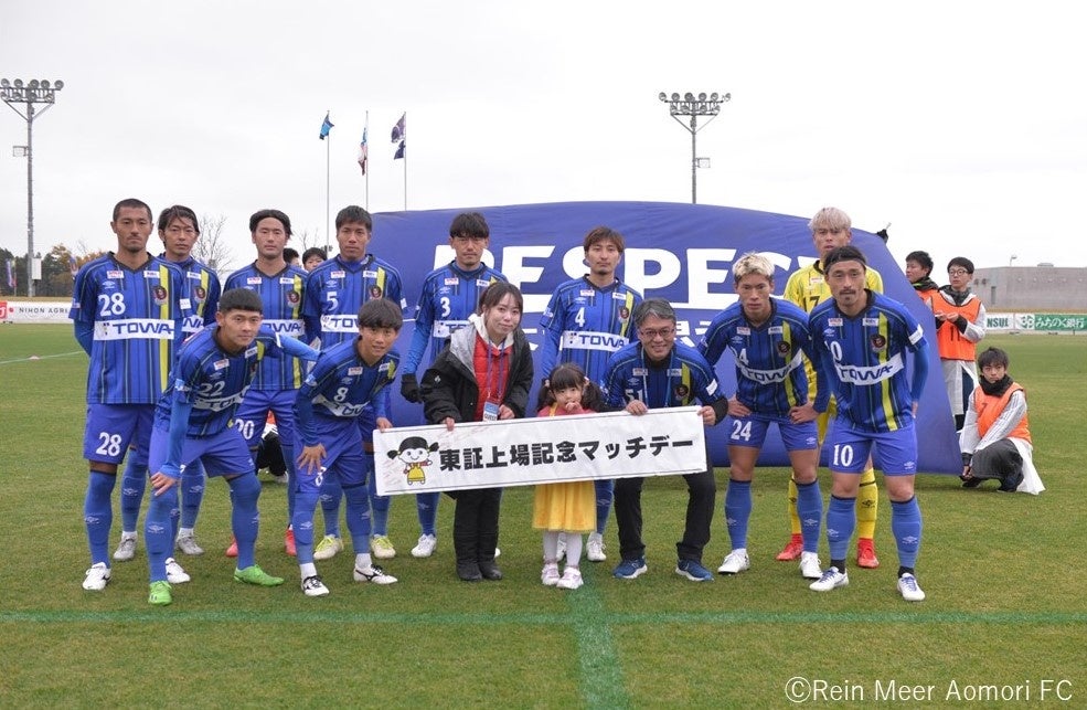 当社の本店所在地・青森県青森市をホームタウンとする、日本フットボールリーグ(JFL)に所属するサッカークラブ「ラインメール青森FC」とソニー仙台FCの試合が11月12日(日)に新青森県総合運動公園球技場にて開催されました。最高気温5.9度、小雨が降り凍えるような寒さの中、624名の観客とサポーターが来場。この日の試合は東証上場記念マッチデー。岡村恒一代表取締役社長が「恒一」にかけた「51」の背番号ユニフォームを着てキックインセレモニーを務めさせていただきました!