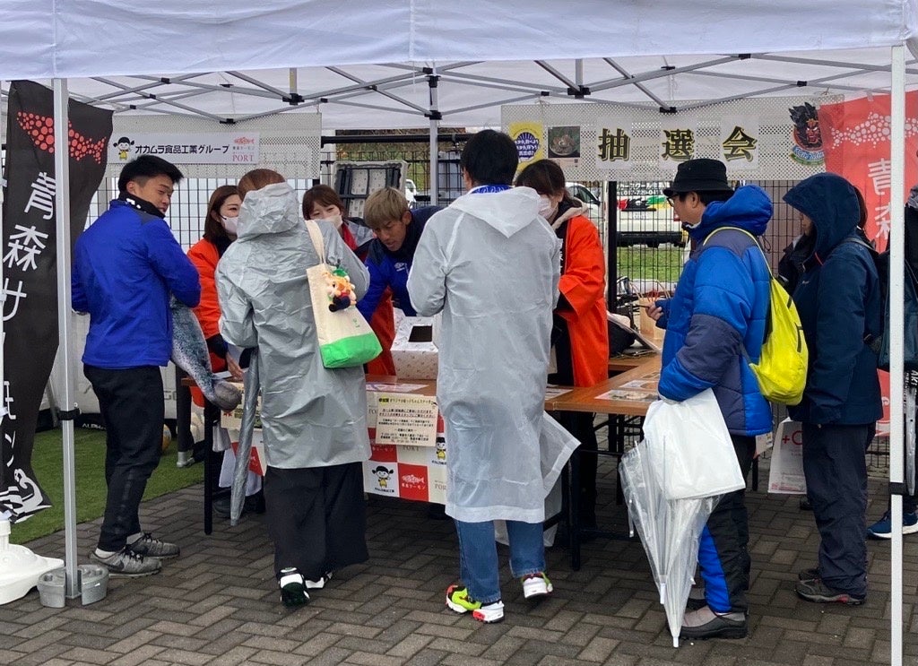 試合前にはブースにて弊社商品が当選する豪華くじ引きを開催。商品には青森サーモン燻製とばチップスやポートの活き造り一夜漬け筋子、いくらなど。当選した方々からは驚きと喜びの声が! 中にはご家族全員が商品を引き当てるなど、ブースは大盛況となりました。