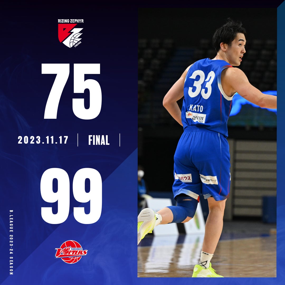2023年11月17日(金)に開催されました【ライジングゼファーフクオカvs.熊本ヴォルターズ】において“福岡75-99熊本”の結果となりましたことお知らせいたします。