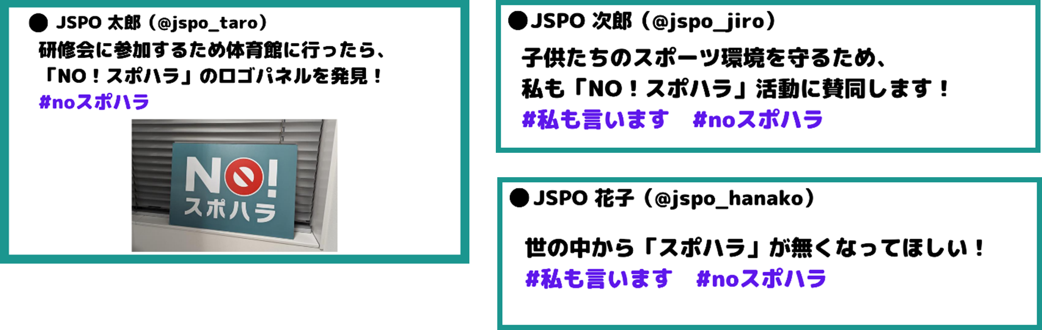このアクションは、個人や団体がご自身でお持ちのSNSにおいて主体的に「NO!スポハラ」を発信いただくとともに、当該発信者とSNS上でつながる多くの方にも「NO!スポハラ」を周知することを目指したものです。