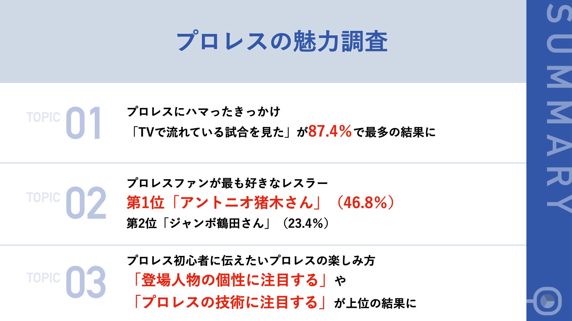 今回の調査では、プロレスファンの熱いプロレス愛を感じ取れる結果となりました。プロレスには様々な魅力があり、可憐にリングコーナーからジャンプする飛び技や、数々ある豪快な技はもちろん、興行の合間にあるエンタメ性や個性的な選手などと語り尽くせないようです。一度、プロレスを観戦すると魅力に取り憑かれてファンになってしまうことでしょう。