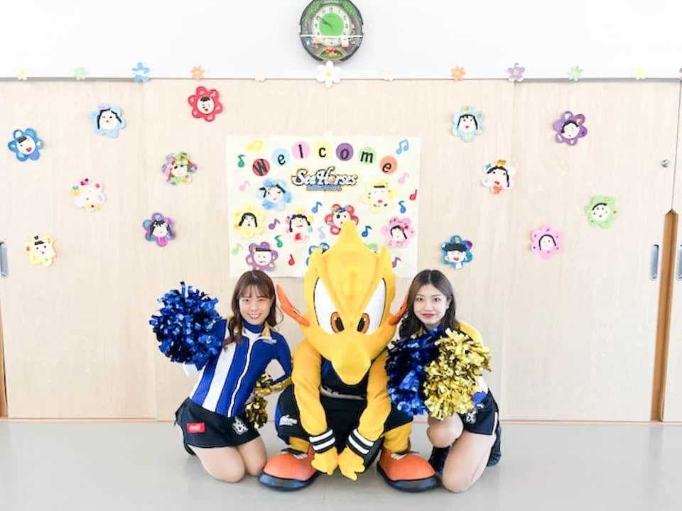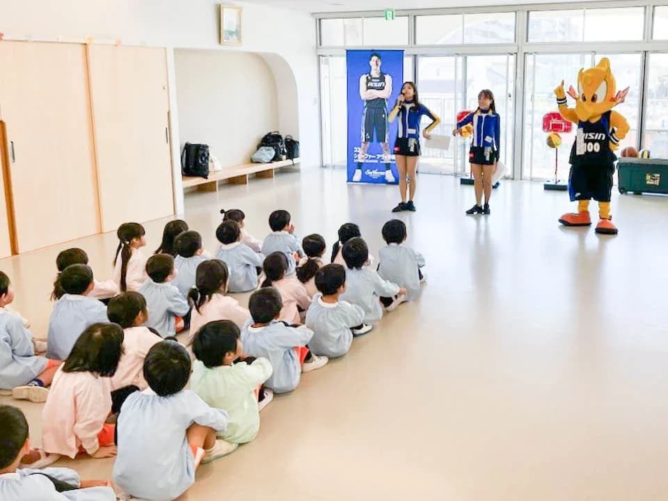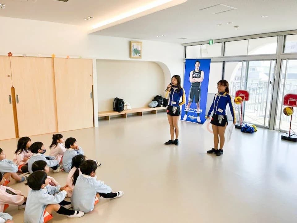 2023年11月16日(木)、シーホースくんとSuper GirlsのMIYUU、NANAKAがてらべクリエイティブこども園(安城市)を訪問し、園児の皆さんと一緒にクイズやダンスを楽しみました。