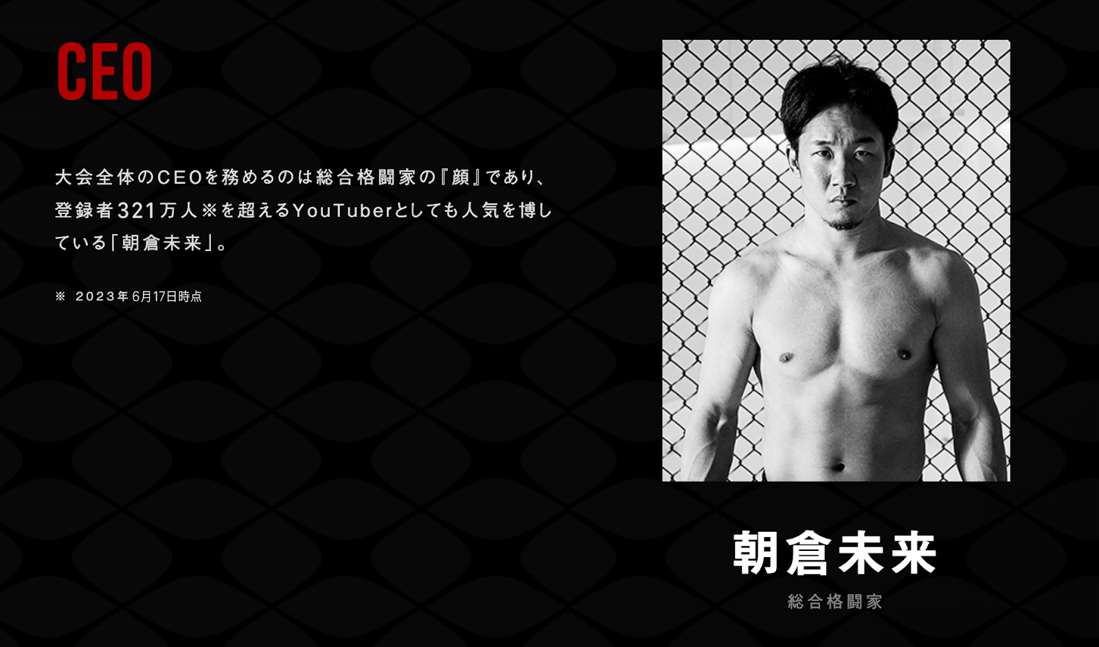 登録者数321万人超え(2023年6月現在)の人気YouTuberでもある総合格闘家の朝倉未来がCEOを務め、スペシャルアドバイザーとして総合格闘家の朝倉海、総合格闘家の白川陸斗が参画しています。