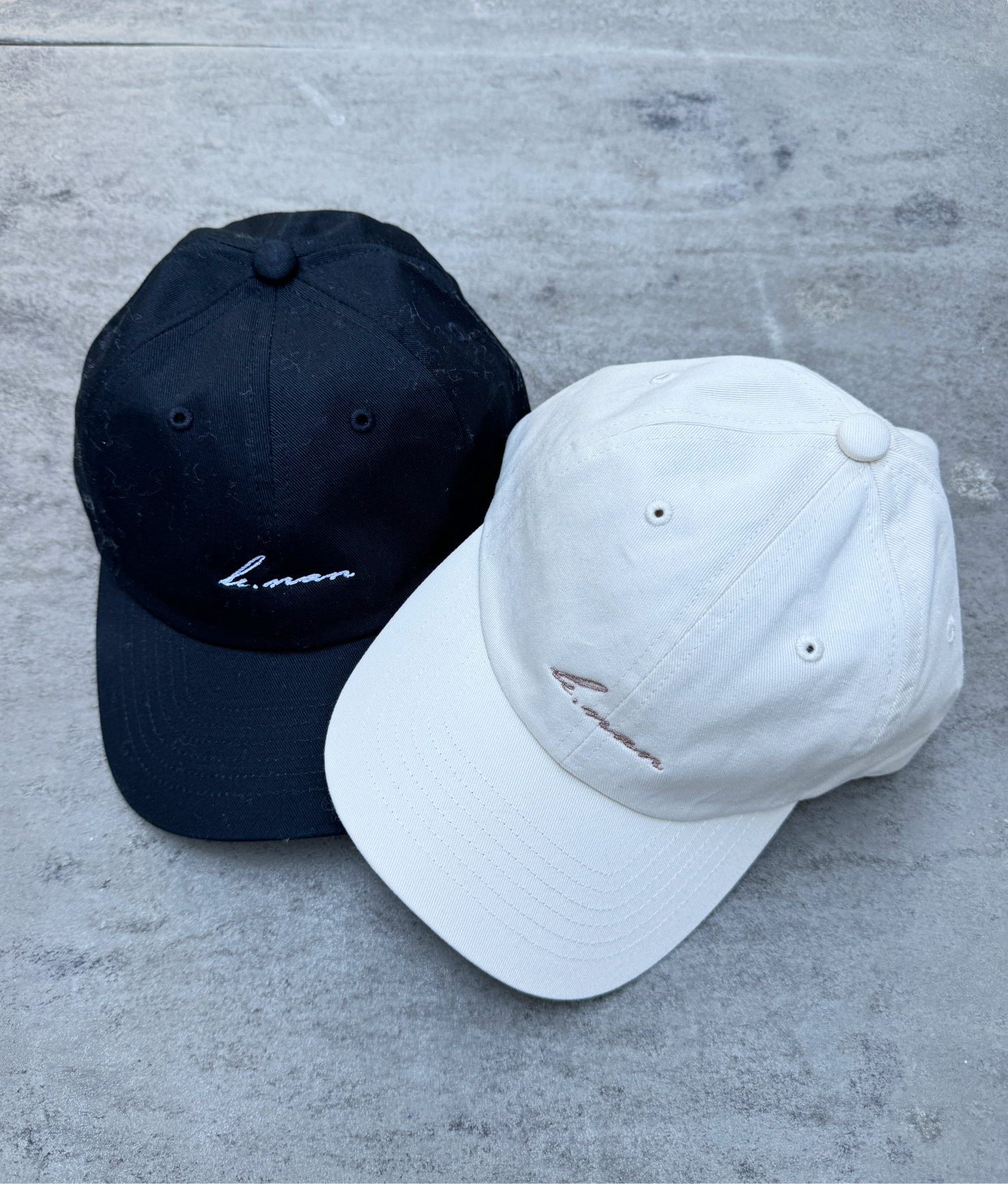 LE.NANのロゴ刺繍入りキャップ:アイボリー&ブラック